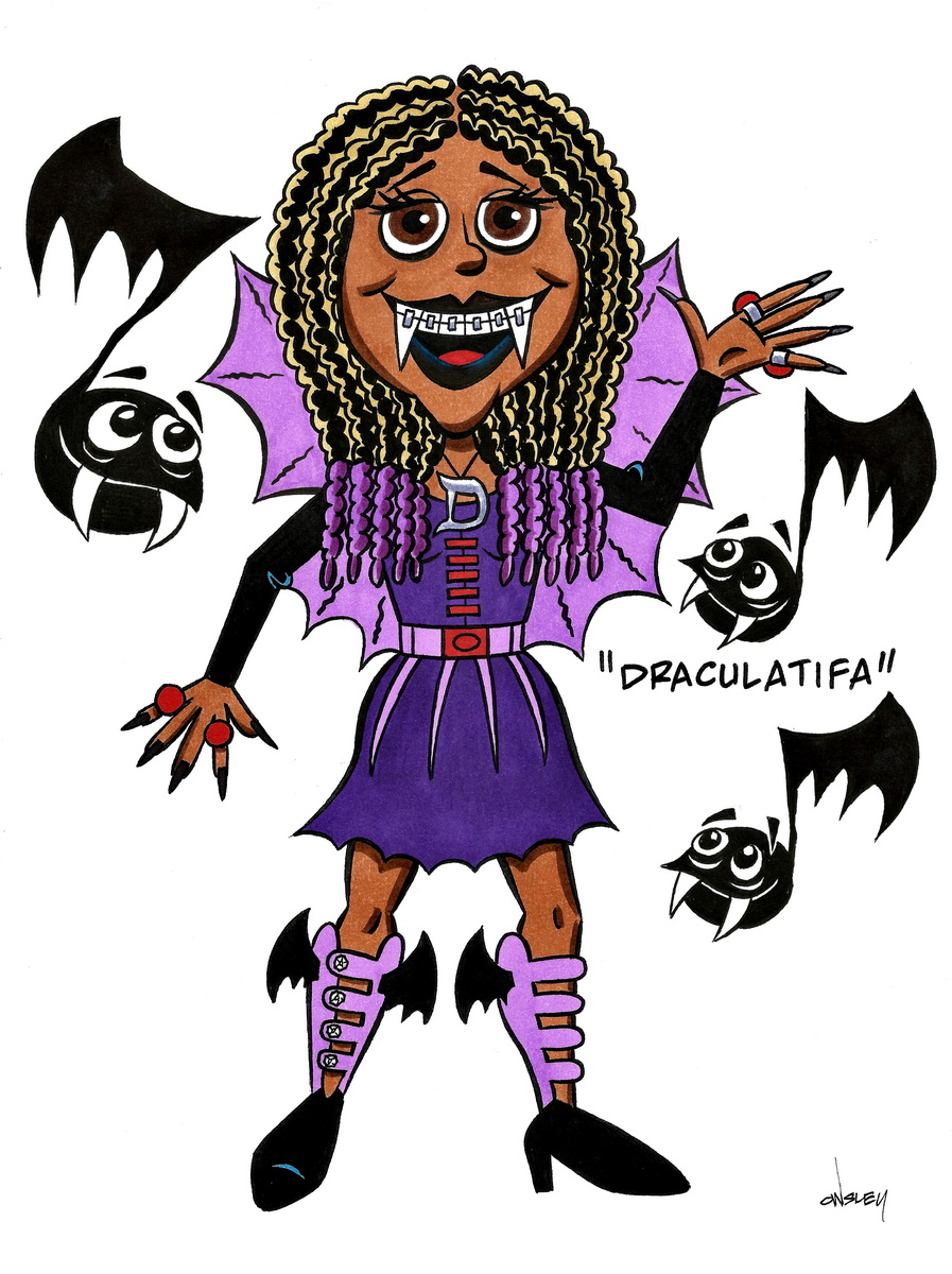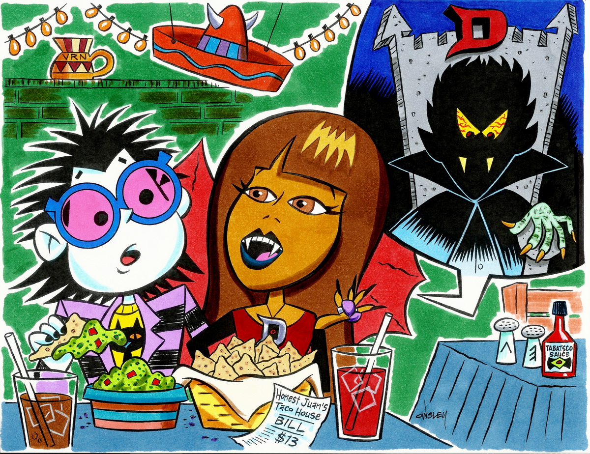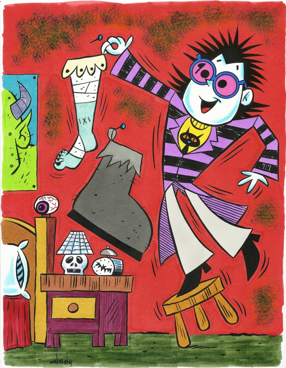 A beautiful young girl with a haunting, musical voice visits Donnie’s house. She’s dressed like a rockstar, has beautiful fangs (with braces!) and long braids. She informs Donnie that her name is Draculatifa, she’s one of Dracula’s daughters, and Santa told her that Donnie might be able to help her get her Christoween® songs published. Donnie’s feelings toward this young lady are unlike anything he’s experienced before!