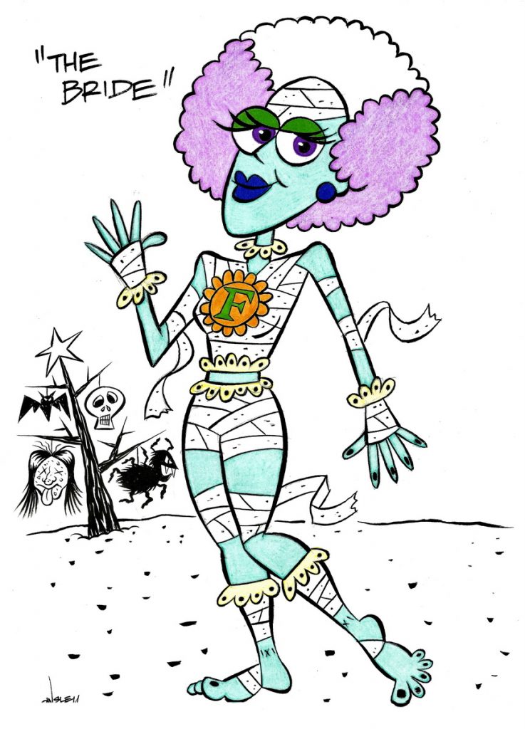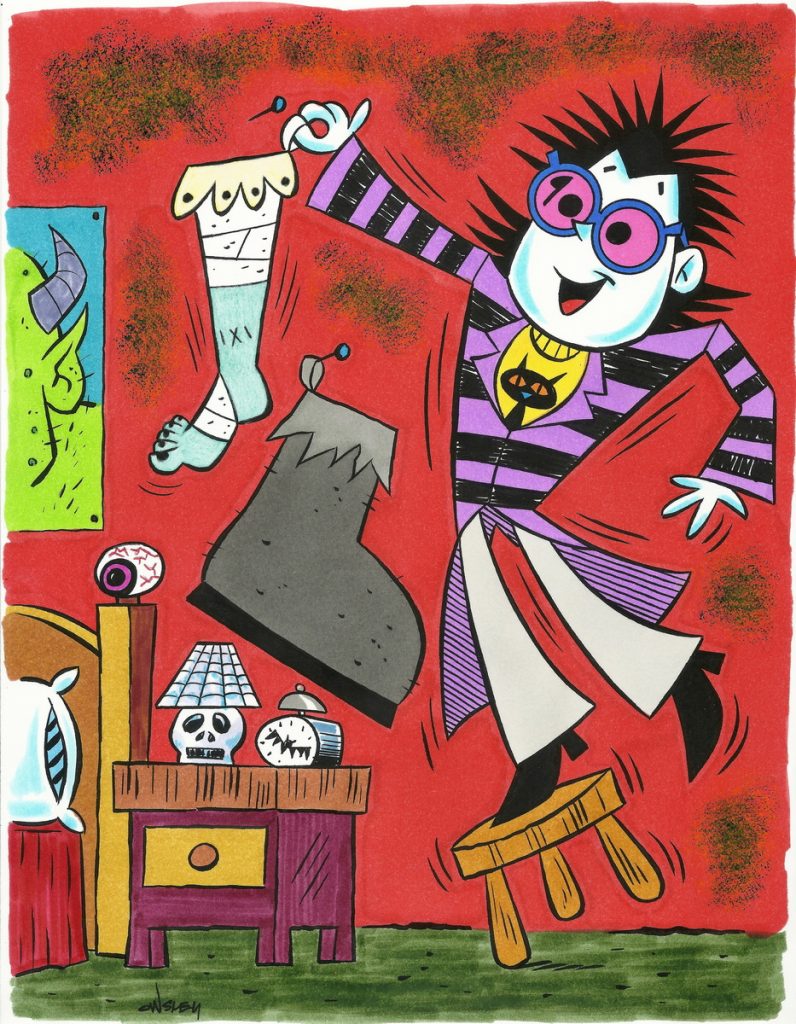 A beautiful young girl with a haunting, musical voice visits Donnie’s house. She’s dressed like a rockstar, has beautiful fangs (with braces!) and long braids. She informs Donnie that her name is Draculatifa, she’s one of Dracula’s daughters, and Santa told her that Donnie might be able to help her get her Christoween® songs published. Donnie’s feelings toward this young lady are unlike anything he’s experienced before!