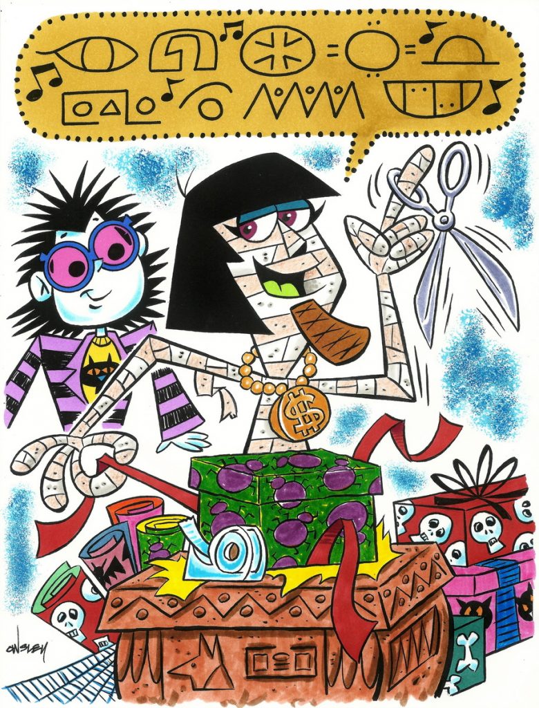 Mort Mummy is new in town and doesn’t know anyone. But he’s quickly befriended by Donnie Druthers who’s unafraid of his appearance. But Mort must find a job, and soon. Noticing how neatly Mort’s bandages are wrapped, Donnie suggests he get a job at a Christoween® store wrapping gifts. And since Mort is also a hip hop artist, he not only gets the job, but soon becomes the world’s first “Wrapped Wrapping Rapper” and finds international fame!