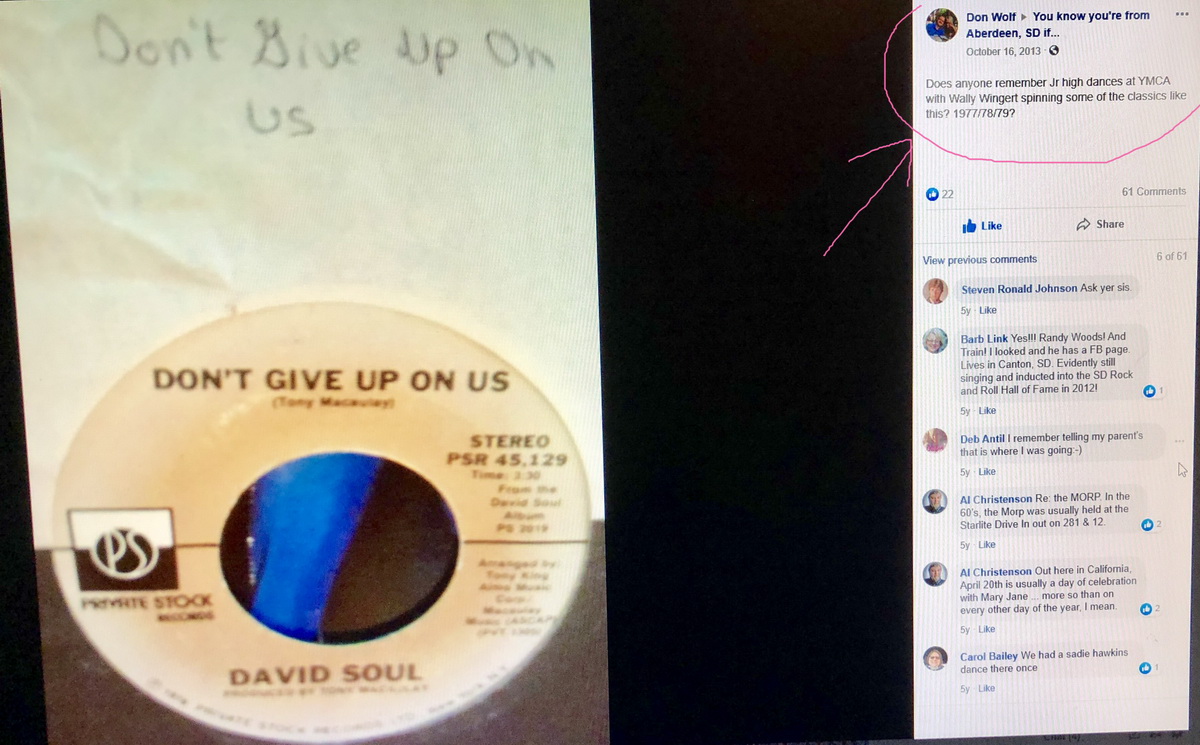 While researching facts for my upcoming radio show in my hometown of Aberdeen, South Dakota over Labor Day weekend, I ran across an Aberdeen appreciation Facebook page. I was shocked when I saw THIS post! Yes, I did in fact DJ dances when I was about 15 at the local YMCA. I had one record player, a menial record collection, and one microphone I had borrowed. I connected an electric guitar cord from the headphone jack of my record player into the guitar amp. In the amp’s second channel I plugged my microphone in. I used a small lamp to see so I could put the needle on the record, (it was very dark in the YMCA gym) and obviously there was a gap between songs so I could change to the next record. But the kids didn’t seem to care; they got to snuggle with members of the opposite sex and I got to play DJ. Plus, I made 50 bucks…which seemed like a FORTUNE back then!! But the year was around 1975/76. I’m glad somebody else remembered those dances!