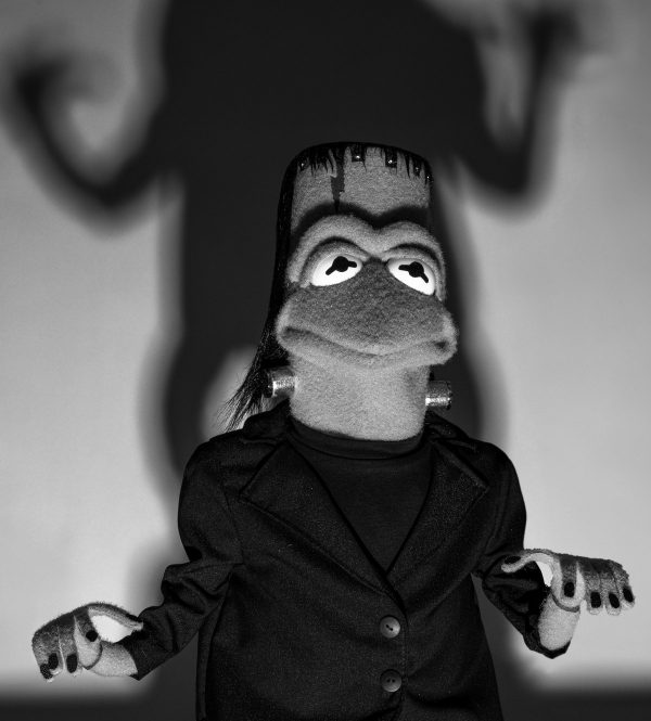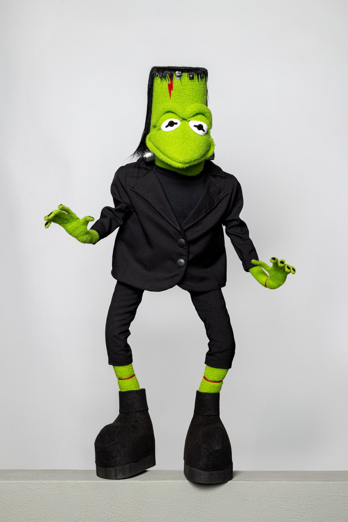 The headpiece was attached with Velcro to Kermit’s head, and was fabricated by Drew Massey and myself. I made the bolts out of foam cord, silver lame, flat metallic buttons and magnets. They were held onto the puppet’s neck with magnets. The costume was created by Alex In Wonderland, and I built the boots out of L200, microsuede and Velclro. The scars and fingernails were made from the reverse side of male Velcro, which bit into the fleece of Kermit’s legs and wrists nicely.