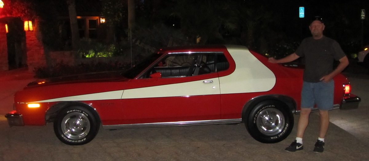 Friday the 27th – MAJOR BRAIN FART! – The room wasn’t as cool as I would have liked, so around 11am I woke up to contact the hotel’s engineering.  He came up to the room and switched something over in the AC system and it started cooling off a little more.  While I was up I figured I’d order breakfast again, and then head back to bed.  I tried taking Roxy back to the dog park later in the afternoon, but it was still too hot.  When we got to the dog park the first thing I noticed was the absence of the usual locals.  If the LOCALS know it’s still too hot for doggy fun, then I’m going to take their cue and go back to the hotel.  I stashed Roxy in the ever-cooling room and Brittney and I walked to Ruby’s to enjoy some salads.  Around 6pm I hopped in the SUV to drive to Indio, about 25 miles from Palm Springs.  I would be meeting with my pal Marcus who owns a beautiful 1976 “Starsky-ized” Gran Torino.  Brittney wanted to stay back at the hotel with Roxy so I went by myself.  It was a very enjoyable ride down the 111 highway.  The 111 takes you through all the desert cities; Cathedral City, Palm Desert, Indian Wells, Rancho Mirage, LaQuinta and then Indio.  I had the sunset at my back, and I was listening to one of the Native American flute CDs I purchased at the street fair. I was amazed at the quality of the recording. It was quite lush and full!  Perfect music for cruising through the desert cities on a gorgeous spring evening!  Marcus, his family and I enjoyed dinner at Jackalope  Ranch, and then I got to drive his Torino.  It was a beautiful piece of machinery, and he had done a lot of great work on it.  He’s a perfectionist like me.  What a thrill!  I said my goodbyes, got in my Dodge Journey, rolled down all the windows, and headed back to the hotel.  A stunning night with a warm desert breeze blowing through my car made me a bit high.  But sadly it was short-lived.  I pulled into the hotel’s valet and I realized with horror that I had forgotten my sack (the black leather satchel I take everywhere with me) in the backseat of Marcus’ Torino…30 miles back!!  I tried to call him and didn’t get an answer. I tried texting him and didn’t get an answer. I was panicking because my entire life was in there!  Credit cards, ID, everything!  I tried calling him again and thankfully he answered.  Doubly thankfully he agreed to meet me halfway in Palm Desert to return my sack.  That way I wouldn’t have to drive all the way back to Indio.  What an idiot I am!  I was so elated to drive the Torino I totally lost my head!  Figuring it was a nice night, I packed Roxy in the back, rolled down all the windows so she could enjoy the cool, evening breeze, and headed to meet him.  When I got back to the hotel I was stressed a bit. When I do stupid stuff like that it really irks me, and sometimes I’m much too hard on myself.  But I went to the upper pool deck, kicked back with my cigar and just watched the sky for a while.  That really helped me to come down from my self-loathing funk.  Brittney and I went to get another NYPD pizza and we watched the stars on the balcony again while we dined.  I did some packing in preparation for my Saturday exit, and  spent a few hours on the balcony with Roxy watching stars for one final night.