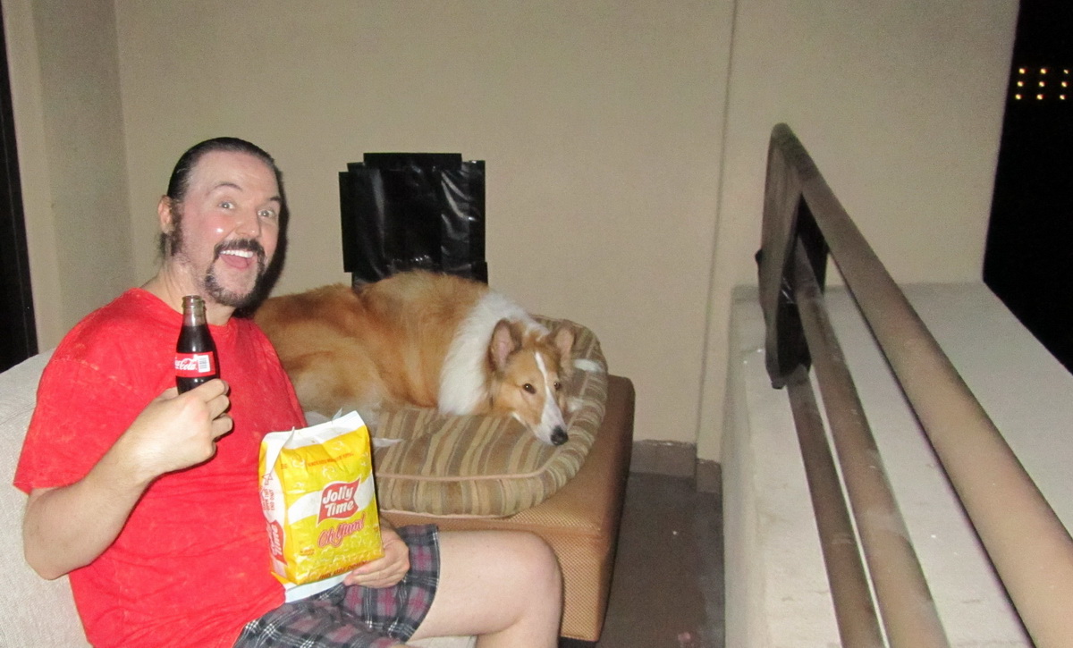 Wednesday the 25th – PM? AM? WHAT’S THE DIFFERENCE? – Roxy had to go out around 11am, so I got up and took her outside.  When I got back to my room it was about 11:15.  I saw the little menu/door hanger thingie on the door knob, so I figured I’d order breakfast.  The door hanger said “BREAKFAST SERVED 7:00am to 11:00pm.”  GREAT!  They serve breakfast all day!  I called Room Service and ordered.  But the girl on the other end said that they stopped serving at 11am.  I told her their menu clearly said 11pm.  She was surprised and agreed to make the breakfast anyway.  Nice!  All this time their menu was printed erroneously and nobody noticed but me???!!  The lovely Tamara brought the breakfast to me and I thanked her profusely.  I also gave her the door hanger thingie and she agreed to take it to her manager to show them the mistake.  I went back to bed and slept until about 3:30.  Then I lounged around for a bit and waited for it to cool off.  Right around the time the sun set behind Mount Abe (the mountain that looks like the profile of Abraham Lincoln that’s right outside my hotel room) Roxy and I went to the Palm Springs dog park.  What fun!  Roxy ran herself ragged!  We got back to the room and then walked to Ruby’s to have dinner on the patio.  It was an absolutely perfect, clear night!  I picked up a cigar at Fame, bought some candy and soda at Rocket Fizz and headed to Lappert’s Ice Cream to get my traditional Dole Whip.  But when I got there at 9:32 they had already closed!  WHAT?  I thought they were open until 10?  Who closes at 9:30?  I can see 9, or even 10, but 9:30?!  Ch-ch-ch-changes!  Oh the cruelty!  No Dole Whip for me!  Roxy and I got back to the room and we both crashed for a few hours.  Figuring I had until 1:30am to get a pizza at NYPD Pizza across the street I sauntered over around 1am.  But they had stopped making pizzas and were only offering slices!  OH NO!  Missed it again!  Ch-ch-ch-changes!  So I headed back to the hotel lobby to weigh my options.  It was then a guest came in and complained of chest pains and a tingling left arm.  Esther behind the desk called 911 and got paramedics over immediately.  He was a young guy too, but said he was sleeping and woke up with the common symptoms of a heart attack!  A guy named Will and his girlfriend came into check into the hotel and he and I started chatting.  He was a former Marine and he and his girlfriend were in town for some fashion show.  What a great guy!  He enjoyed petting Roxy for a long time.   At that point I had no other option than to go upstairs and reheat my buffalo chicken strips in my microwave oven and get ready to stargaze.  It was a clear night so the stars were bright and present.  I even got to watch Jupiter set behind Mount Abe.  Around dawn I went to bed.
