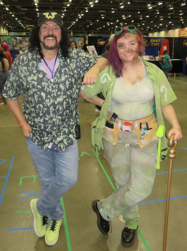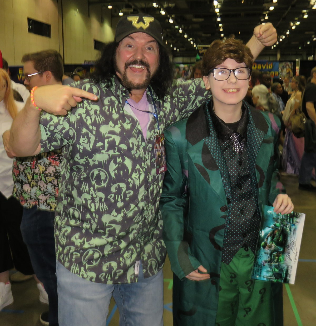 Saturday the 13th – HUNTSVILLE COMIC & POP CULTURE EXPO: DAY 2! – As expected, the con was much busier today. It was fun meeting all the really nice people. My assistant Kaitlin had gone to Target the night before and bought me some Pure Leaf iced tea (which I couldn’t find at Circle K), and some Wonder hamburger buns for more taco burgers! YAY Kaitlin! I introduced myself to Paige O’Hara, the voice of Belle from “Beauty and The Beast,” and told her how excited I was that she would be appearing in Sioux Falls in July at our Voices Against Cancer convention. She said she was looking forward to it. I asked her to please give my regards to her husband Michael Piontek. He played Raul in the L.A. run of “Phantom of the Opera” back in the early 90s. When I worked at 94.7 The Wave as a D.J. we worked quite closely with the “Phantom” cast doing a lot of fundraising. I had known Michael quite well during those days. I also introduced myself to George Takei, who was in the Green Room eating lunch (NOT taco burgers, by the way). I told him that he was the first celebrity I met when I came to L.A. back in 1987. He was nice enough to have myself and the Wave’s news director over to his home to record an interview. I had met him several times after that at various “Star Trek” functions, as he played Mr. Sulu in the original series. I told George and his husband that I was a Voice Actor. I asked if they had flown in on American Airlines, and they said they did. I said, “Does this sound familiar? Please make sure your safety belts are securely fastened around your waist. We’ll be landing soon.” They laughed and said, “Yes!” I also told them that I had done several text-to-speech projects, which takes typed out text and translates it to verbiage through a computer interface. The program builds the sentences based on things I had recorded previously. I told him, “It’s amazing that as a ‘Star Trek’ fan since I was young, I now have literally BECOME ‘Star Trek!’ I’m the talking computer!” I also told him how excited I was that he would also be an upcoming guest at this year’s Voices Against Cancer event in Sioux Falls in July. My buddy (and “Sonic Boom” and “Arkham Origins” co-star) Roger Craig Smith was at the convention too, and Roger will ALSO be in Sioux Falls in July. This will be a great show! I got back to my table after lunch and met some really great Riddler cosplayers! I also met a few really cool doggies. We had a “Bleach” panel, which consisted of Johnny Yong Bosch, Michelle Ruff, Neil Kaplan, and me. But there wasn’t a monitor speaker on the stage, so it was very difficult to hear the questions from the audience. I guess we need to start writing that into our contracts, as it’s become a real problem of late. The speakers are facing away from the stage toward the audience. So all we’re hearing on the stage is the bounce-back of the audio after it hits the back wall and comes back at us. It’s not only difficult to hear the other actors on the panel, but it’s really difficult to hear the fans ask questions. Many of them are very soft-spoken anyway. After the show ended I had a bit of a headache, so I headed back to my room for a nap. By the time I got up later all the food places had closed, so I was forced to get some “hotel lobby” food, which consisted of microwaveable soup and mac and cheese. Oh well. Since it was late and I wasn’t very tired, I decided to go down to the common area in the lobby and just relax in the nice chairs and watch the fountain. A guy named Rocky approached me and said we had met when I appeared at the Chattanooga Comic Con back in October. It was nice seeing him again. He asked me to join his group and chat for a bit, so I moved over and joined them. Nice folks! We talked until late, and then I headed upstairs to turn in.