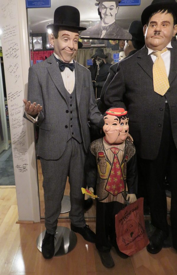 Tuesday the 9th – SALAMI, SONS, & SADNESS! – An animated film I’ve been working on is in the final stages of completion, but they needed me to record a few pick-up lines. So I drove to Salami studios in North Hollywood to record them. The actual session only took about 15 minutes, but I ended up chatting with the producers for almost an hour! I hit Taco Bell for some lunch, and then I headed home to do some work. I printed number stickers to put on my sample character photos, so the number on the sample photos (which will be displayed in clear plastic holders) will correspond with the photos in my file case. This will make identifying the desired print much easier for my assistant at the table. Since I have about 24 different photos that I offer at my table, this took a considerable amount of time. My buddy Dr. Cowen came over to see the original “Sons of the Desert” fez I bought at auction recently. I also showed him the new suit I put on my “Stannequin.” We’re both members of the local “Sons of the Desert” Laurel & Hardy chapter, and tonight was another meeting. He dropped by to check things out before we headed to dinner. Dr. Cowen’s had an amazing life, which included meeting George Reeves, Elvis Presley, and even Stan Laurel during the last year of his life. The meeting was a blast, and we watched the short “Our Wife,” which is absolutely hysterical. Dr. Cowen said, “No matter how many times you see it. It’s still funny.” Indeed. One of the long-time members of the chapter recently passed away, and in her final wishes she expressed that her Laurel & Hardy collection be raffled off to raise money for the chapter. I bought $20 worth of tickets and won some nice things for my collection. After the meeting I came home to record my nightly auditions, and finish up my photo file for the con this weekend. Later I took my nightly WOG and spent some time unwinding outside in my anti-grav chair. I prepped some more for my upcoming trip this weekend, and then I made some barbecues and watched another “High Chaparral” episode. I also watched the “Collector’s Call” episode on my DVR from the previous Sunday. The season premiere featured a collector all of us “collector folks” knew well… Dr. Stewart Berkowitz. He had amazing stuff, including original costumes from “Batman,” “Gilligan’s Island,” and the original set from “The Tonight Show Starring Johnny Carson!” Sadly, Dr. Berkowitz passed away about a month ago unexpectedly. So his dream of putting all of his stuff into a museum will probably never be realized. Very sad.