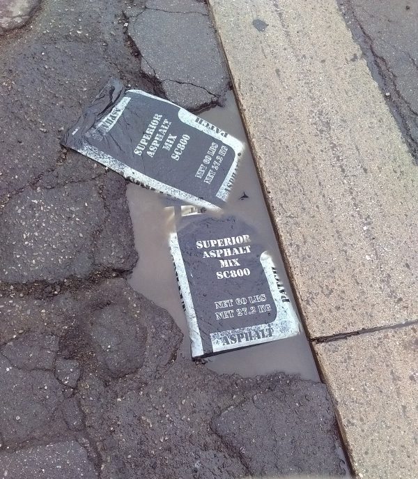 “No, no, no. You’re supposed to MIX the asphalt and fill the hole, not just throw the bag in it!” More evidence I saw of lazy people on Stupid People Day.