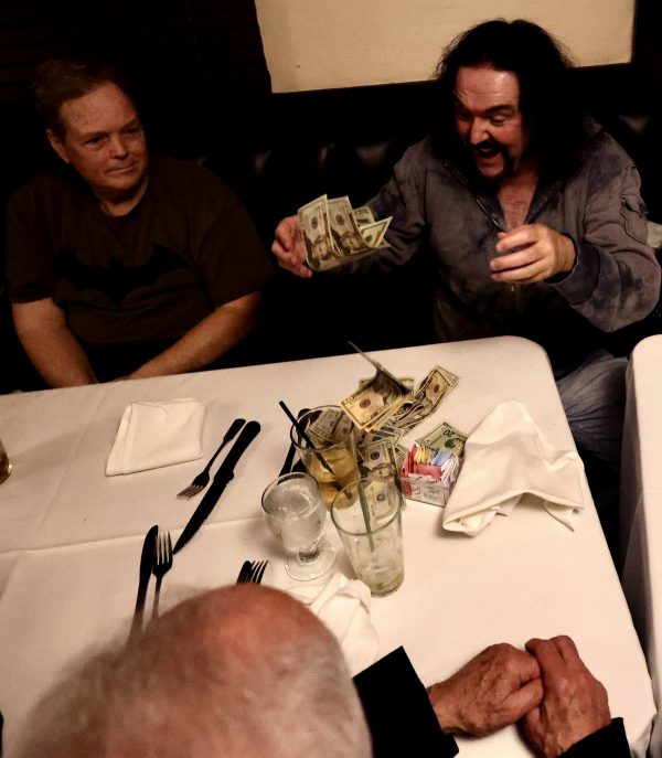 Sunday the 16th – SQUARE, SMOKE HOUSE, SAD, SARA & SPOOK! – Late in the afternoon my pals Officer Mark and Miss Connie came by to help me set up my Square account on my new Square Terminal device. I even made a mock purchase of $25 just to make sure everything was working perfectly! GREAT! Then we drove over to the Smoke House for our long-awaited tribute to those loved ones we’ve lost in 2023. At the memorial for our “adopted grandma” Shirley at the church in late February, many of Shirley’s movie night friends couldn’t make it because it was on a weekday morning. So we decided to set up our own “tribute” at Shirley’s favorite restaurant…the Smoke House. The date we all agreed on was April 16th. But between the time we set the date, and by the time the date actually arrived, we lost several more kind souls in the process. So we turned it into a group tribute. In addition to Shirley, we lost Roxy, my friend Edi’s dog Bunny, Edi’s step-father, and my friend James’ dad. I had three enlargements printed up and put into frames that I had intended to put on our tables for our tribute. One photo was of Shirley with the little Laurel and Hardy dolls she won at one of the Sons of the Desert meetings. One was of Shirley and Roxy, along with Edi’s daughter Ems. And the other was one of Shirley and Bunny at one of the Palm Springs street fairs. We had the entire back room of the Smoke House to ourselves, and it was great. I got there at 7:00, and most everyone had already arrived by that time. I walked in to put the pictures on the tables, but I noticed three nails on the wall that looked like they used to have pictures on them. So I took the three frames I had and hung them on the nails. It was PERFECT! We had a very nice dinner, toasted those we’ve lost, and had some nice conversation and fellowship. It was a much-needed release of emotions and comradery. Many of us had not seen each other in years! It was a very, very nice evening. After dinner I drove the Mustang to my auxiliary parking and swapped it out for the Gray Ghost. I got home just in time to meet up with Sara, who came by to do some work and trim Spook’s nails. I grabbed a nap, and when I got up I was craving Denny’s salad and buffalo chicken strips. I drove to Denny’s (which was very quiet on a Sunday night) and got my order. Then I watched a few episodes of “The Muppet Show” and ate my food. One episode had a cameo of several “Sesame Street” Muppets, and it was absolutely delightful! I finished off the night by watching a couple of episodes of “Have Gun – Will Travel” and then I hit the hay.