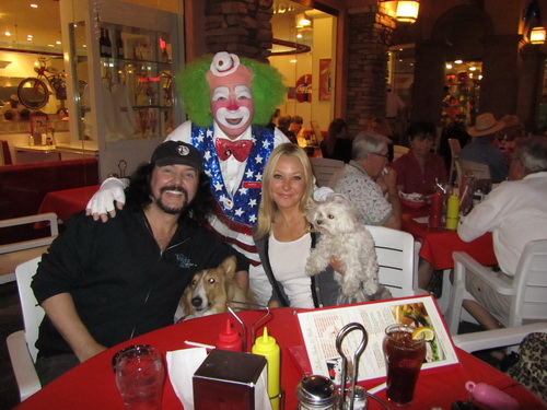 Our old friend Harpo the Clown stops by to visit with us again on the patio of Ruby’s Diner.