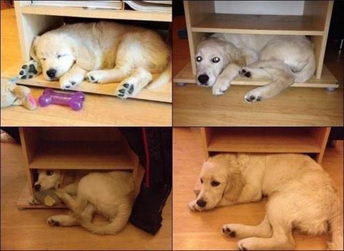 I try to resist having the Random Pic of the Week feature the same subject matter from one week to the next, but #1…I love dogs. #2…I think you love dogs too. #3…this is totally hilarious! It’s a “time-lapse” photo in a sense. The first frame shows a new puppy taking refuge in the bottom shelf of a bookcase. A few months later, the second frame shows him getting a little bigger, and a little less able to fit into the space. Frames 3 and 4 are hysterical, as he’s trying desperately to fit into his favorite little place, but he’s gotten much too big. And finally by the fourth frame, all he can fit in is his right shoulder. Gotta love it!