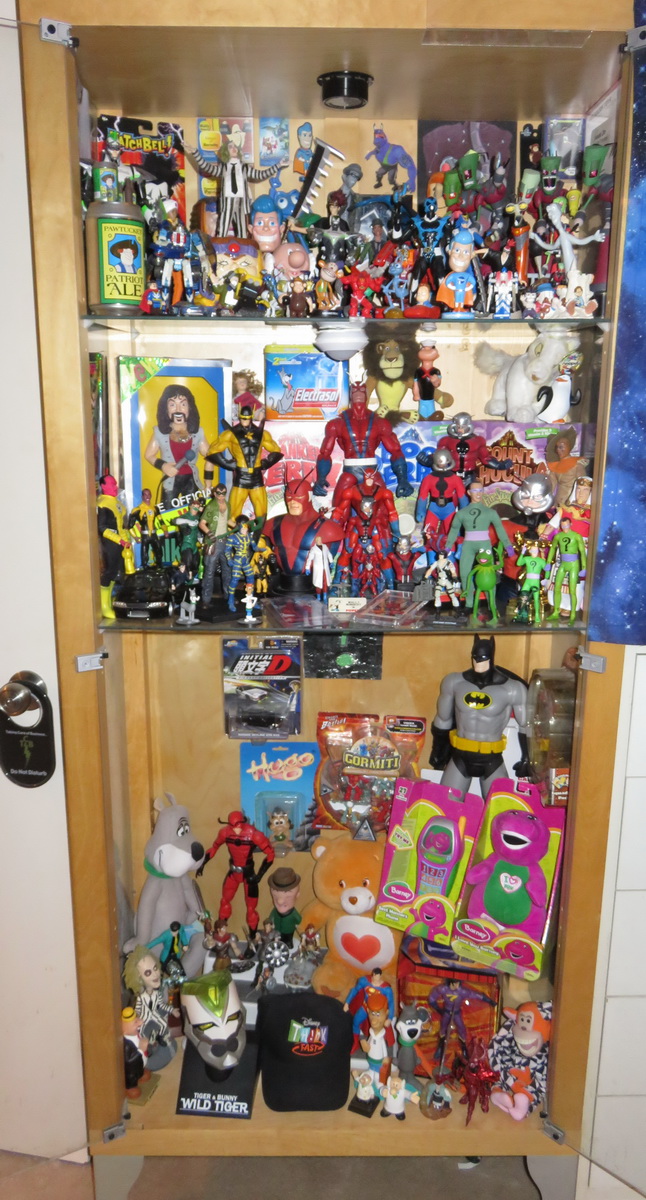 Tuesday the 16th – I VANT TO DRAW YOUR BLOOD! – Boy did it feel good to sleep in until 3! Shortly after I woke up I decided to go over to a place called Quest Diagnostics to have blood drawn. My doctor and I decided it was about time I got a physical, since it had been a while. He wanted to start with all sorts of blood tests to see how I was doing. Then I’ll follow that up with an in-office visit to check my heart, and all the other stuff. Aside from the nagging cough from the cold I had a few months ago, I have always felt really good. I get my walks in, stay active, and don’t eat “too” crazily. Since the last thing I ate was at 8:30 that morning, before I went to sleep, it had been about 8 hours since my last meal. When you draw blood you have to fast to give them an accurate reading, so it was perfect! I got in, gave them the paperwork, had several vials of blood drawn, and headed over to Arby’s to get lunch. (So much for the “not eating too crazily” thing) But I was craving a beef ‘n’ cheddar! Then I went over to Fast Signs to pick up a new sign they printed for me for my Batman and Robin display. Since I added my updated Robin figure the signage didn’t properly reflect the credits for those who contributed work to it. I went to my mailbox and got my packages, and then got home and did some work around the house. I recorded an audition, and then grabbed a nap on the couch. When I got up, I started a project I had been promising myself I’d do for a while. Since Easter was approaching, and I committed to playing Jesus on Easter morning for the kids’ “Easter Walk” at church, I had to move some of my lifesize figures around in the Chaney Room to get at the closet door to dig out the costume. While I was there I found several other jackets and shirts that I no longer needed, that I would sell on eBay soon. I’ve sold so much stuff already, that opening my Chaney Room costume closet is no longer a dreaded experience. There was a time when I couldn’t squeeze even a t-shirt in there, it was so stuffed with clothes! But I have extra room on the clothes rack now, and it’s a beautiful thing! I got the Jesus costume out and hung it in my living room. While I had the figures moved around, and I had access to my record album cases, I decided to breeze through those and pull out LPs that I no longer needed. That case TOO was overstuffed with albums! I figured if I could just get rid of 20-30 unneeded albums, I would have a lot more room in the case for the albums to be pulled out and examined easily when I needed them. Just as I was unloading the shelves to peruse the records, the top shelf collapsed! One of the cheesy little plastic supports that had been holding the shelf up all these years finally gave up the ghost! Now I would need to go buy metal supports to replace them before I could put everything back where it belonged. I had three shelves of things in that case. The bottom shelf was full of record albums, and it had a plywood support to keep the shelf above it from bowing. Above that was another shelf of record albums, and again a plywood support to keep the shelf above that from bowing. And the top shelf was full of Lon Chaney books, photo albums and other resource materials. Since it WAS the Chaney Room, after all, that was the place for it. But books are heavy, so the shelf support just gave way under the pressure. It was bound to happen sooner or later, so I was glad it happened while I had everything out and was working on it. That particular shelf held records from A to P. I ended up pulling out about 20 albums that I didn’t figure I needed any longer. Plus, while I had everything out, I decided to file them in different categories. I split them into Soundtracks, Children’s, Comedy, and Music by Artist name. That way, I’d be able to land my hands on the album I needed much more easily. But until I purchased metal shelf supports at the hardware store I couldn’t do much more work with them. So with piles of records everywhere, and lots of lifesize figures standing around, I danced around the mess and shut the door to the Chaney Room for the night. I did one other audition, fed and walked Roxy, and then started with my big upstairs project that I had been planning for a while. Since I got my new Rowlf the Dog puppet made, I wanted to add him in with the other Muppet replicas I have in my Tranquility Zone (my master bedroom). I have two cases in my room that each contain toy representations of characters I’ve voiced in my career. Whenever I voice an iconic character, I’m always really adept at finding a representative action figure or related toy to add to the case. One case is full of toys from original animation or videogame characters I’ve performed (Tallest Red, Riddler, Ant Man, etc.), while the second case is full of anime characters I’ve performed when I dubbed Japanese anime into English (Renji, Wild Tiger, Dr. O’Shay from “Astro Boy,” etc.). I already cleared out the top shelf of the anime cabinet a while back to put my 1:1 Gonzo replica in there. So the bottom shelf was where I consolidated all of the anime toys. My Mahna Mahna replica Muppet has been in a custom-built Plexiglas case on top of the cabinet for a long time. But due to Rowlf the Dog’s size, I need to put him on the top of the cabinet (his custom-built case is currently being constructed by my pal Kyle at Plastic Depot in Burbank) and put Mahna Mahna in the bottom part of the cabinet where the anime toys were. So I decided to cull through the anime toys, remove certain redundant characters, and consolidate them with the animation toys in my first cabinet. Of course when you pull out toys that have been in a cabinet for a long time, there is quite a bit of dusting required, and rearranging of the toys so they all fit. It was QUITE the major undertaking. I found that removing the plush figures freed up a lot of room, as plush figures take up considerably 
