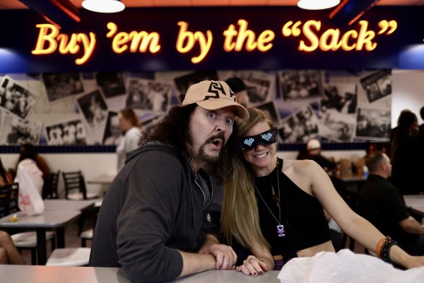 Friday the 21st – VIVA LAS VEGAS! – Emily came over to begin her house sitting gig for the weekend, and I drove to my box to pick up some prints I had made of one of my “Family Guy” characters. It’s a screenshot from an episode where the two bald weightlifters sing “Steak and Eggs.” That had been brought up to me a few times when I was in Sacramento, so I figured I’d have a print made up to sell at the show. Before my flight took off I had time to enjoy a salad on the patio at Paty’s, and then I sped off the airport. I valet parked, and then found out that my flight had been slightly delayed. In fact, most ALL of the Southwest flights that day were delayed. I hoped they wouldn’t cancel it altogether! But it all worked and I got to Las Vegas easily. The flight is very, very short; not even an hour. I was met by Michael the driver, and we drove through Las Vegas to head to the hotel. Since the venue for the show was closer to the downtown area than the famous “strip,” they had us all staying at the Golden Nugget. I’m not a fan of Las Vegas, particularly. And I’m really not a fan of downtown Las Vegas. I had heard that the downtown hotels had been upgraded, but I was a bit skeptical. Sure enough, as we pulled up to the hotel, the G was burned out on the Golden Nugget sign. “THE OLDEN NUGGET.” Perfect. Olden…like the olden days…the days when this hotel was actually relevant. When I checked in the gal at the desk noticed my Jeff Lynne’s ELO hoodie and said she was a fan. It was fun talking music with her. Then I lugged my carry-on bag, my luggage and my photo case all the way across the casino to the VIP tower. It wasn’t easy, but I did it. I got settled and Beth, one of the representatives from my management company Celebworx, brought me a jug of distilled water for my nasal rinse. Right around the same time my pal Officer Mark arrived and we decided to grab an Uber and head to the Peppermill (one of our favorite places in Las Vegas) for dinner. While we were there my pal Amanda texted me to let me know she had just landed in Las Vegas and was on her way to the restaurant. While we waited for her to arrive, we went next door to the Walgreens and picked up some supplies for the weekend. I had no idea that Walgreens sold fresh fruit, so I grabbed a few bananas for breakfast! When Amanda’s cab arrived at the restaurant Mark and I hopped in and joined her and headed back to the hotel. We decided to go out on Fremont Street to see the Fremont Experience. The Fremont street area is considered “old Vegas,” but they’ve covered the entire main drag with a huge arched video screen that shows wild videos and advertisements. They had a deejay playing music at ear-bleeding levels. The street is pedestrian-only now, and no cars are allowed on the street. It’s a huge party area, and the smell of weed was everywhere. In fact, it became kind of a game to try and dodge all of the pot clouds we encountered. We got Amanda some food at White Castle, and then headed back. With all of the people on the street dressed as showgirls, Chippendale dancers, and robots, it was refreshing to see a guy dressed up as Dr. Doom from The Fantastic Four comic books. Come to find out he was there for the Anime convention, so we chatted for a while. But we all had endured enough of the craziness so we headed back to our rooms. In all of the times I’ve been in Las Vegas I’ve never seen so many things malfunctioning before. But there seemed to be a lot of things “not working” there. Last time I was there it was 2019 and everything was working well, so perhaps these days it’s more of a supply chain issue. My hotel room was good, but the shower was odd. First off I’m not a fan of the “rainshower” shower head. They had one of those in the shower, and the shower never really fully turned off. When you’d crank the handle all the way closed, it was still leaking. Oh well, it’ll suffice for two days. I got organized for the next day and hit the hay, as the van would be picking up the actors at 9:45 to be at the show on time.