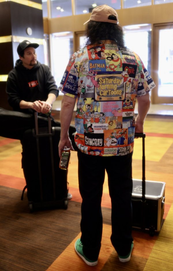 Saturday the 22nd – ANIME LAS VEGAS: DAY 1! – When 9:45 arrived I was joined in the lobby by my fellow “Bleach” Voice Actors Johnny Yong Bosch and Michelle Ruff. There were many other Voice Actors in the group as well, and we headed to the World Market Center for the convention just before 10. As we pulled up we saw the line of fans waiting to get in that was wrapped around the building, down the block, and into the parking garage! This was going to be a GREAT show! As always it’s great meeting all of the fans of the shows I’ve worked on. One guy told me a wonderful story about how the show “Tiger and Bunny” positively impacted him after the death of his father. He loved how my character Kotetsu was a good single dad, and he commented on how much heart I put into the performance. I love hearing words like that, and knowing that the work has meant so much to people. It was a very touching story, and when I put on the Kotetsu hat for him, he said he was going to try not to cry. Amazing. There were a lot of amazing cosplays at the convention too. Our lunch never arrived, so I didn’t take a lunch break at all. I did get some food at the concession area and brought it back to my table, but I continued signing all day. Officer Mark took a ton of great photos, and Amanda had fun making friends and running around the convention. A guy named Mauricio came up to my table and told me that he was working with Tyler Kaufman, the nephew of Andy Kaufman, on the proliferation of the Kaufman estate. Tyler is the son of Andy’s brother Michael, and it seems like Tyler is very proactive in promoting the Kaufman brand. That’s GREAT news! I told him I would participate in any way possible to continue the legend of Andy! I can’t wait to see how this develops! When the show closed at 6 we all got in the van and headed back to the hotel to change clothes and freshen up. Mark, Amanda and I got a cab (Uber wasn’t working very well on Mark’s phone) over to the Green Valley Ranch casino to meet my pal Bruce Kulick (legendary rock guitarist) and his wife Lisa for dinner. After the fray of the day it sure was nice to eat a nice, quiet dinner with friends in a relaxed atmosphere. After we took our leave we decided to walk around the area outside for a while. I had gotten a bag of popcorn from the movie theatre in the building, and I just walked around with Mark and Amanda outside enjoying the warm, desert evening and eating my popcorn. It made me excited for my upcoming trip to Palm Springs! We managed to find an Uber to take us back to the Olden Nugget, and when I got back I got packed up and organized for the final day at Anime Las Vegas!