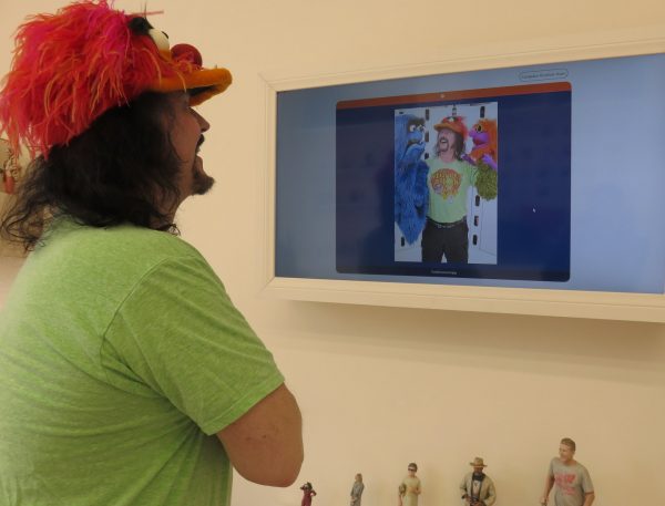 Monday the 17th – DELIGHTFUL DOPL! – Even though I got up fairly late, I wanted to get to my box to pick up the Dopl miniature that I posed for two months ago at the Henson Studios just before the “Puppet Up!” show. Though it took a while to arrive, it was fantastic! It captured my friend Angi and I perfectly, and the computer even added in the Skeksis Chamberlain from “The Dark Crystal!” It’s an amazing 3 figure piece that’s about 9 inches tall. It will figure prominently in the Puppet Room. Since my friend Emily was house sitting for a neighbor a few doors down, I brought her along with me so we could get an early dinner at Paty’s after I picked up my Dopl. We ate on the patio at Paty’s, and then I came back home to do some work, record my auditions, and take a nap. When I got up later I worked on the computer, typed out Wally’s Week, and tried to dye some socks green. First I tried to overdye yellow socks with some blue dye (in hopes they’d turn green) but they were too dark. Then I tried to dye some white socks with a dye called Green Apple, but they weren’t as vibrant as I had hoped. Since I was so happy with the miniature figure that Dopl sent me, I scheduled time this Thursday to do another one. This figure will be just me and two puppets, and I’ll call it “At My Happiest.” If you’d like to see Dopl’s work check out their website at dopl.com! I need green socks for what I’m planning for my new miniature figure!
