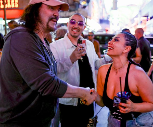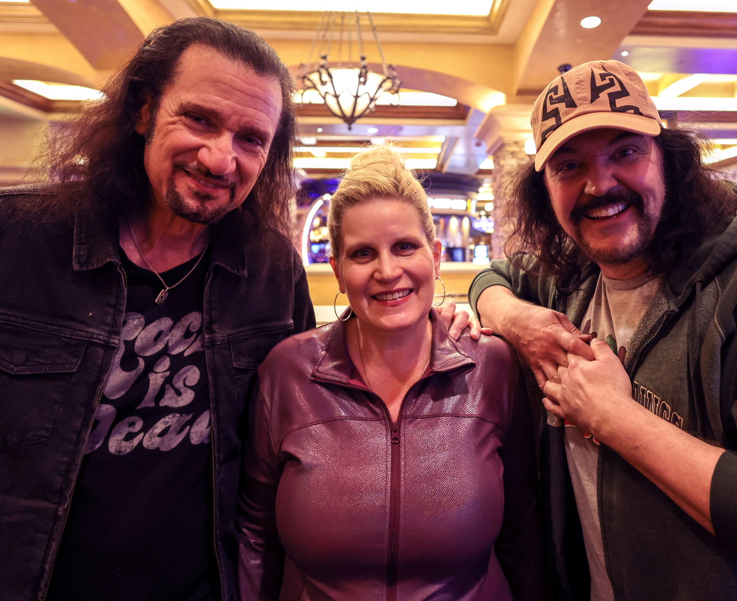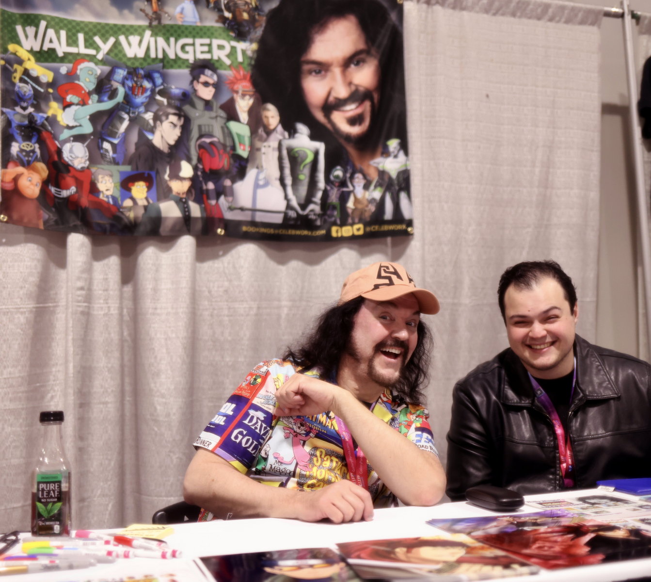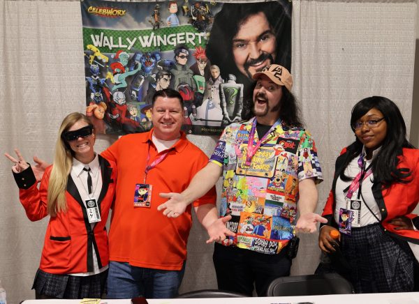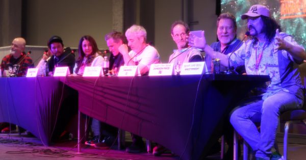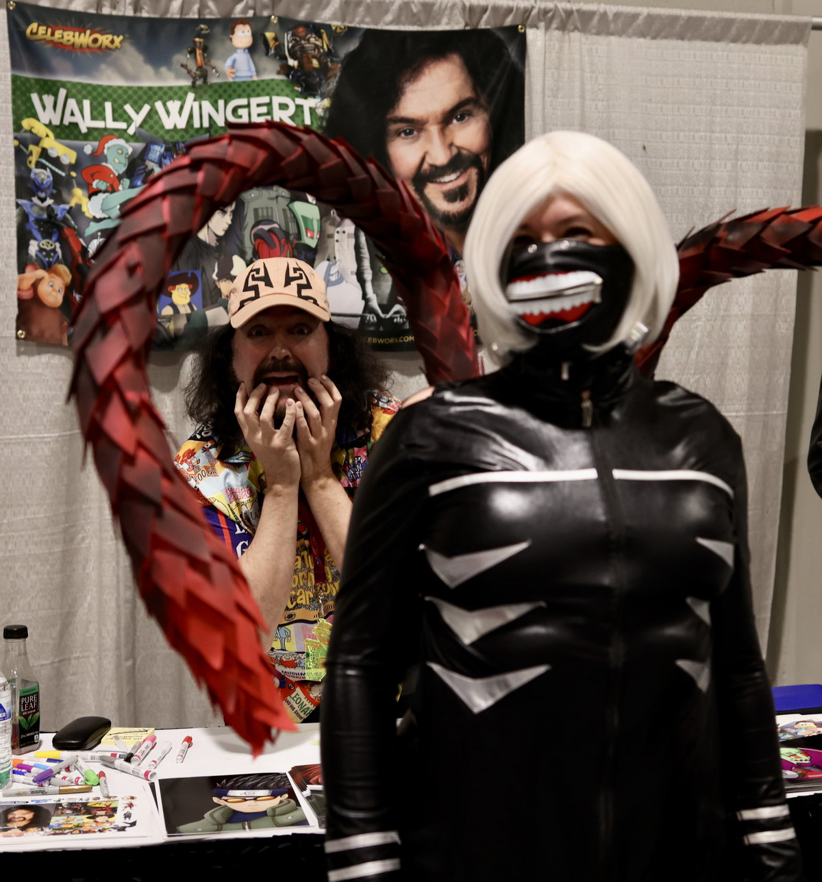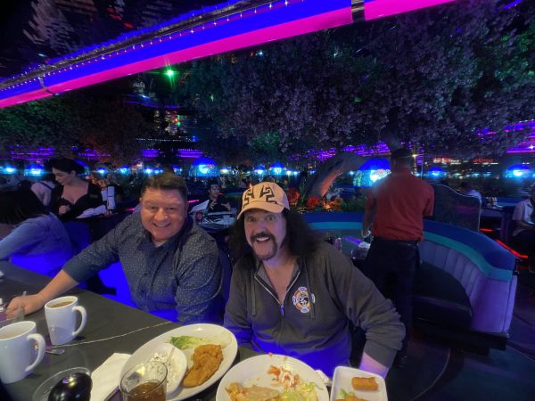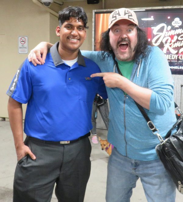 Saturday the 22nd – ANIME LAS VEGAS: DAY 1! – When 9:45 arrived I was joined in the lobby by my fellow “Bleach” Voice Actors Johnny Yong Bosch and Michelle Ruff. There were many other Voice Actors in the group as well, and we headed to the World Market Center for the convention just before 10. As we pulled up we saw the line of fans waiting to get in that was wrapped around the building, down the block, and into the parking garage! This was going to be a GREAT show! As always it’s great meeting all of the fans of the shows I’ve worked on. One guy told me a wonderful story about how the show “Tiger and Bunny” positively impacted him after the death of his father. He loved how my character Kotetsu was a good single dad, and he commented on how much heart I put into the performance. I love hearing words like that, and knowing that the work has meant so much to people. It was a very touching story, and when I put on the Kotetsu hat for him, he said he was going to try not to cry. Amazing. There were a lot of amazing cosplays at the convention too. Our lunch never arrived, so I didn’t take a lunch break at all. I did get some food at the concession area and brought it back to my table, but I continued signing all day. Officer Mark took a ton of great photos, and Amanda had fun making friends and running around the convention. A guy named Mauricio came up to my table and told me that he was working with Tyler Kaufman, the nephew of Andy Kaufman, on the proliferation of the Kaufman estate. Tyler is the son of Andy’s brother Michael, and it seems like Tyler is very proactive in promoting the Kaufman brand. That’s GREAT news! I told him I would participate in any way possible to continue the legend of Andy! I can’t wait to see how this develops! When the show closed at 6 we all got in the van and headed back to the hotel to change clothes and freshen up. Mark, Amanda and I got a cab (Uber wasn’t working very well on Mark’s phone) over to the Green Valley Ranch casino to meet my pal Bruce Kulick (legendary rock guitarist) and his wife Lisa for dinner. After the fray of the day it sure was nice to eat a nice, quiet dinner with friends in a relaxed atmosphere. After we took our leave we decided to walk around the area outside for a while. I had gotten a bag of popcorn from the movie theatre in the building, and I just walked around with Mark and Amanda outside enjoying the warm, desert evening and eating my popcorn. It made me excited for my upcoming trip to Palm Springs! We managed to find an Uber to take us back to the Olden Nugget, and when I got back I got packed up and organized for the final day at Anime Las Vegas!