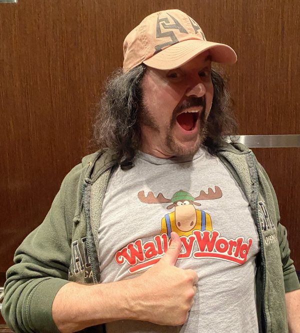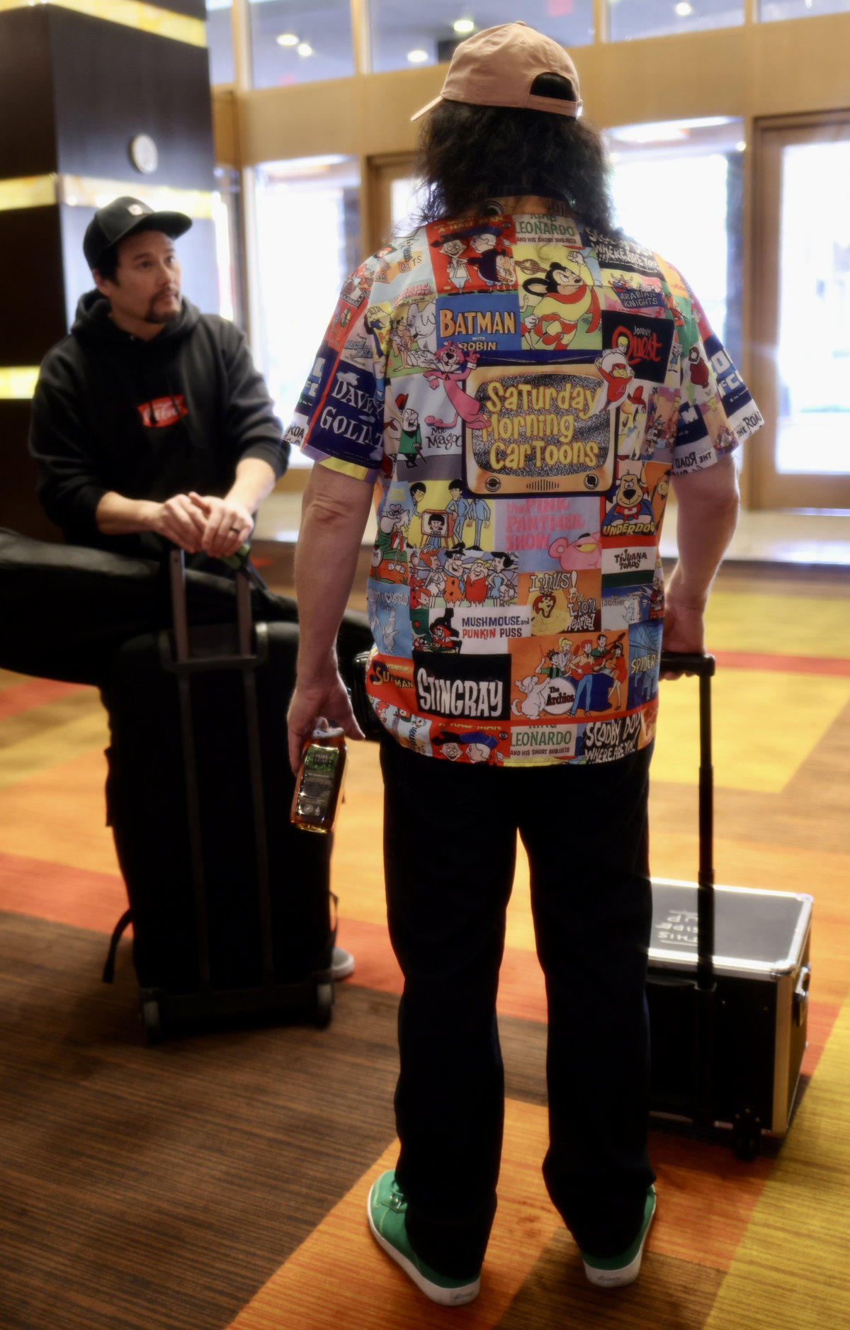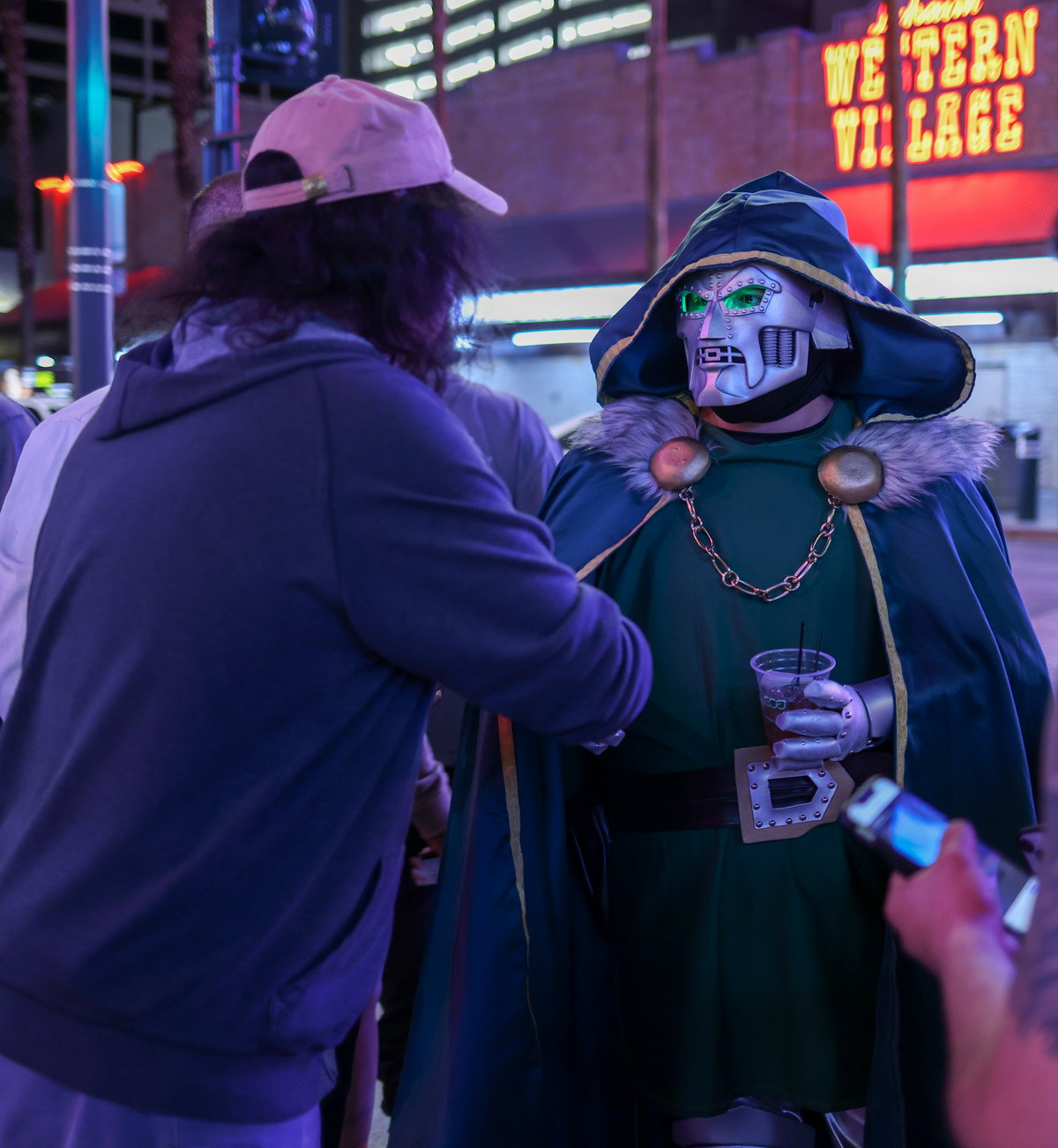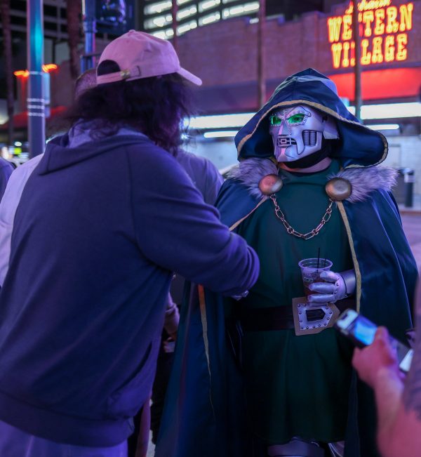 Friday the 21st – VIVA LAS VEGAS! – Emily came over to begin her house sitting gig for the weekend, and I drove to my box to pick up some prints I had made of one of my “Family Guy” characters. It’s a screenshot from an episode where the two bald weightlifters sing “Steak and Eggs.” That had been brought up to me a few times when I was in Sacramento, so I figured I’d have a print made up to sell at the show. Before my flight took off I had time to enjoy a salad on the patio at Paty’s, and then I sped off the airport. I valet parked, and then found out that my flight had been slightly delayed. In fact, most ALL of the Southwest flights that day were delayed. I hoped they wouldn’t cancel it altogether! But it all worked and I got to Las Vegas easily. The flight is very, very short; not even an hour. I was met by Michael the driver, and we drove through Las Vegas to head to the hotel. Since the venue for the show was closer to the downtown area than the famous “strip,” they had us all staying at the Golden Nugget. I’m not a fan of Las Vegas, particularly. And I’m really not a fan of downtown Las Vegas. I had heard that the downtown hotels had been upgraded, but I was a bit skeptical. Sure enough, as we pulled up to the hotel, the G was burned out on the Golden Nugget sign. “THE OLDEN NUGGET.” Perfect. Olden…like the olden days…the days when this hotel was actually relevant. When I checked in the gal at the desk noticed my Jeff Lynne’s ELO hoodie and said she was a fan. It was fun talking music with her. Then I lugged my carry-on bag, my luggage and my photo case all the way across the casino to the VIP tower. It wasn’t easy, but I did it. I got settled and Beth, one of the representatives from my management company Celebworx, brought me a jug of distilled water for my nasal rinse. Right around the same time my pal Officer Mark arrived and we decided to grab an Uber and head to the Peppermill (one of our favorite places in Las Vegas) for dinner. While we were there my pal Amanda texted me to let me know she had just landed in Las Vegas and was on her way to the restaurant. While we waited for her to arrive, we went next door to the Walgreens and picked up some supplies for the weekend. I had no idea that Walgreens sold fresh fruit, so I grabbed a few bananas for breakfast! When Amanda’s cab arrived at the restaurant Mark and I hopped in and joined her and headed back to the hotel. We decided to go out on Fremont Street to see the Fremont Experience. The Fremont street area is considered “old Vegas,” but they’ve covered the entire main drag with a huge arched video screen that shows wild videos and advertisements. They had a deejay playing music at ear-bleeding levels. The street is pedestrian-only now, and no cars are allowed on the street. It’s a huge party area, and the smell of weed was everywhere. In fact, it became kind of a game to try and dodge all of the pot clouds we encountered. We got Amanda some food at White Castle, and then headed back. With all of the people on the street dressed as showgirls, Chippendale dancers, and robots, it was refreshing to see a guy dressed up as Dr. Doom from The Fantastic Four comic books. Come to find out he was there for the Anime convention, so we chatted for a while. But we all had endured enough of the craziness so we headed back to our rooms. In all of the times I’ve been in Las Vegas I’ve never seen so many things malfunctioning before. But there seemed to be a lot of things “not working” there. Last time I was there it was 2019 and everything was working well, so perhaps these days it’s more of a supply chain issue. My hotel room was good, but the shower was odd. First off I’m not a fan of the “rainshower” shower head. They had one of those in the shower, and the shower never really fully turned off. When you’d crank the handle all the way closed, it was still leaking. Oh well, it’ll suffice for two days. I got organized for the next day and hit the hay, as the van would be picking up the actors at 9:45 to be at the show on time.