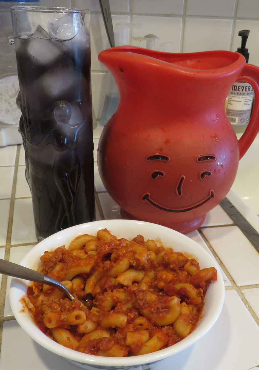 A nice Saturday afternoon lunch! Grape Kool-Aid in a vintage naked lady glass, and goulash, just like my mom used to make! Now…BRING ON THE CARTOONS!