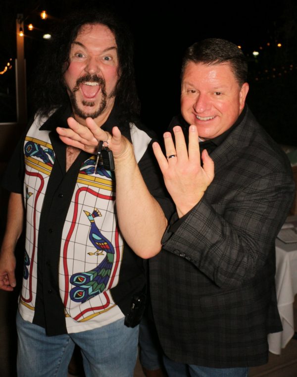 My friends Officer Mark and Miss Connie recently eloped to Palm Springs, and last Saturday was the party celebrating their wedding. Officer Mark and I show off our rings…