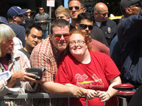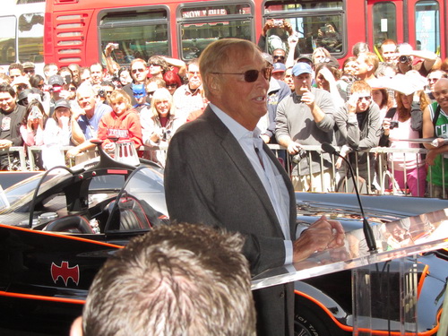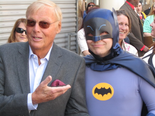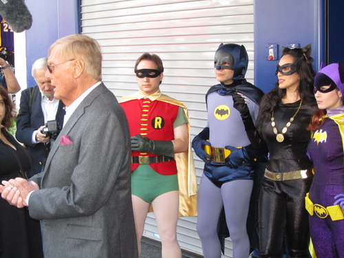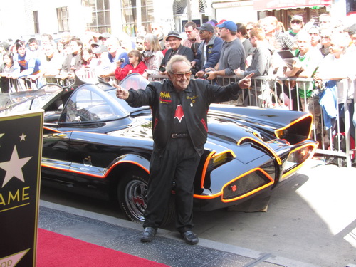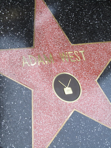 Thursday the 5th – LONG OVERDUE! – Today I would be at the ceremony to give Adam West his long overdue star on the Hollywood Walk of Fame! Many of us have been working, hoping, wishing for this for a long time, and today it came true! Alex got up early to prepare his Robin costume. Scott Sebring dropped by to pick up Sara, Alex Z. and Alex C. for the festivities. They would be driving over to the Roosevelt Hotel and changing into their costumes for the ceremony. I did a few auditions and then showered to get ready to go to Hollywood. I switched out my Gran Torino for my Mustang (I didn’t want some valet scratching my Torino!) and valet parked at the Roosevelt Hotel. I walked over to the star location, right in front of the Guinness museum. I saw tons of friends there…George Barris and the Batmobile, Adam’s agent Fred, Andrew and Tracy from Canada, and Ralph Garman from KROQ radio who spearheaded the whole campaign to get Adam his star! Then Adam West, looking none of his 83 years, showed up and the immense crowd went wild! He looked fit and fab! The ceremony started and Ralph spoke. Then Seth MacFarlane spoke. The two gave very funny speeches. Then a local politician spoke. When he took the microphone I leaned over to my friend Andrew and said, “Oh! And it was going so well!” (I don’t have a very soft spot in my heart for politicians.) They awarded Adam his star and there were tons of photos with friends and family. I walked to the hotel with Fred and a few other friends so we could enjoy the reception and lunch. I went to the bathroom poolside at the Roosevelt Hotel to wash my hands before lunch. In all the excitement I forgot my CAMERA in the men’s room! Adam’s son-in-law James (who has spent the last 3 years working on a documentary about Adam) asked if he could interview me one last time. But all I could think about was my lost camera. I had some amazing photos on that thing! But I collected my thoughts, took a deep breath and just knew that it would all work out. Add to this the fact that “TTS” called and wanted me in early to do some comedy bits, and I was quickly running out of time if I was going to get to work in a timely manner. I did the interview then hurried to the men’s room. NO CAMERA! Luckily the crack security team said they had it in their Lost and Found. GREAT! I described the camera and filled out a bunch of paperwork. TICK TOCK…time was running out and it looked like I wasn’t going to get to NBC on time! I got my camera but it was taking the valet forever to bring my car around! By the time I got through the mess of traffic in Hollywood and got to NBC I was only about 10 minutes late. But we got all the comedy bits done and everything worked out very well. WHEW! We taped “TTS” and then I went home to pass out. I was exhausted but I couldn’t wait to download the photos. I turned on my camera and noticed that my photos had been gone through. Most likely the person who found my camera was looking for something. I’d like to think he was looking for images that would tell him whose camera it was, but he most likely may have been looking for “naughty” photos. Sorry bub. None there. However, the most recent photo taken didn’t look familiar to me. When I downloaded it I got a hell of a surprise. The finder of my lost camera took a photo of him using the urinal, from his perspective. EWWWW! I guess I deserved it for being so lame as to leave my camera laying around, but really? Later that night I met the gang for dinner at Jerry’s Famous Deli and I was so tired I almost fell asleep in my salad! I came home to do my auditions and then hit the hay. Four early mornings in a row, and I had another one tomorrow! YIKES!