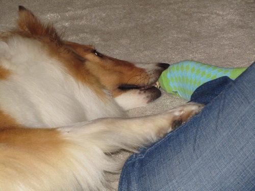 Roxy is right at home with her rawhide chewbone locked between her paws!