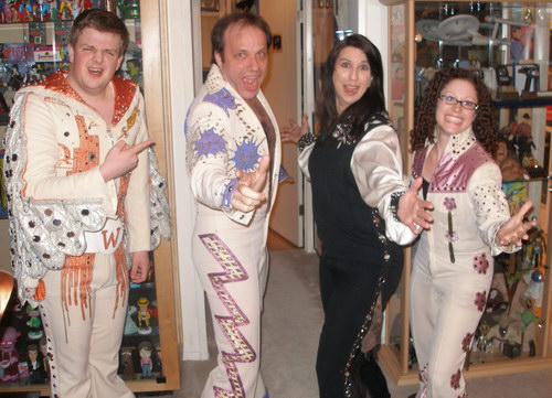 Saturday night silliness! Ben from the U.K. wears an original costume worn by Wayne Osmond, Scott wears an original costume worn by Alan Osmond, Vickie wears an original Merrill Osmond costume, and Teri wears an original Donny Osmond costume.