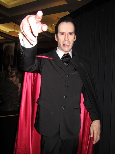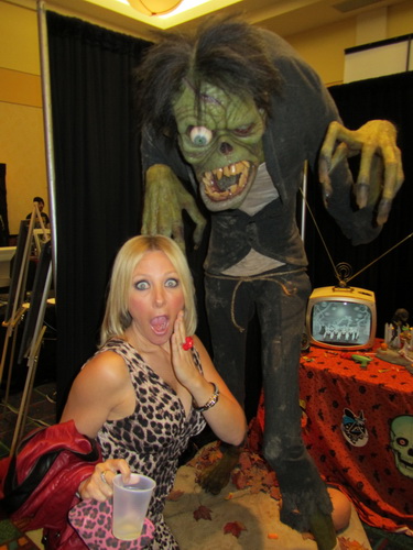 Saturday the 14th – THE CURSE IS OVER! – Well, Roxy was so excited to be at my house that she didn’t let me sleep much. She constantly kept jumping up on my bed and watching to cuddle and kiss. I got up early in the morning, walked her and then waited for Sara and Edi so we could go back to Monsterpalooza. When we got there we found a great parking space just a few steps from the front door! We had already bought our Saturday tickets the night before, so we just waltzed right in past the ever-lengthening line. In fact, I held the door for the great John Landis and I said hi. He sure is a happy guy! We saw my friends the Chaneys (descendants of Lon Chaney Sr. and Jr.), photog Chris Ameruoso, sculptor supreme Mike Hill, the lovely Kelli Maroney, and I bought Edi a cool wallet from Bela Lugosi Jr. with his dad in character as Dracula on the cover! I was waiting to meet Steve Johnson, the special effects guru who designed and created a creature called the “Loafer Alien” for a Disney film called “Can of Worms.” I had bought some conceptual art of this character on eBay from Steve’s studio. This character was one of the first voice-over jobs I ever did, so I wanted to meet him, have him sign it, and tell him I was the voice for the Loafer Alien in the film. But he was very hard to find, and the crowd was growing! In fact, the end of the line was almost touching the front of the line! It wrapped almost completely around the building! Next year they’re going to need a bigger venue! Edi was wearing a dress I loaned her with a monster theme on the pattern. It’s really cool and got a lot of comments. We saw our old pal Paul Glaser who was signing his books for fans. He was sitting next to the lovely Kathryn Leigh Scott and Lara Parker from “Dark Shadows.” In that one room was a good portion of my childhood all together! Starsky, Maggie Evans and Angelique! WOW! I finally saw Steve Johnson coming into the building and had him sign the artwork. I introduced myself and told him about the Loafer Alien job and he said, “You sound just like him!” I don’t think he quite understood the concept I was trying to convey that I in fact WAS the voice of the Loafer Alien. But oh well. This convention is such an overload to the senses I’m not surprised he’s a little foggy. Off he went to find a beer, and off I went to find Sara so we could take off. Just as I was about to pull out of my really cool parking space I heard a voice say, “Wally Wingert!” I turned to see my old pal Special Effects/Make-up whiz Robert Hall! I hadn’t seen him in years! We caught up quickly and I told him he could have my parking space. The curse of Friday the 13th was truly over! Sara and I drove to get lunch at Wendy’s and then went to Verizon to have them look at my phone (which still wasn’t working!) I wasn’t eligible for an upgrade quite yet so I had to pay full price for a brand new phone! I didn’t want to wait the 4 days for the insurance to replace my phone, since I was going out of town and all, so I just bit my lip and paid up. This new Casio phone looked good, rugged and had big easy to see letters. And the best part is…it’s waterproof! There are only a few things I don’t like about it, but I’ll get used to them in time. We headed over to Fast Frame to pick up a framed piece they were working on for my new Robo-Elvis display. It’s a photo I took of Elvis when I saw him in concert on June 22, 1977 along with my ticket stub. While I was there I noticed a large piece of cardboard, and asked if I could have it. I scored it in several places so it would fold up and fit into my car. This would provide a perfect barrier between Roxy’s bed on the floor and my bed. So that way she wouldn’t be able to jump up on my bed all night. I got home and put the Steve Johnson piece back together in the frame and hung it up. Then I grabbed a quick nap before movie night. We watched the Laurel and Hardy classic short “Brats,” followed by “Puss in Boots,” and then the original “Phantom of the Opera” starring Lon Chaney on Blu Ray! It looked amazing! After everyone left I took Roxy on a 40 minute walk around the neighborhood to tire her out and then went inside to finish up some work and hit the hay!
