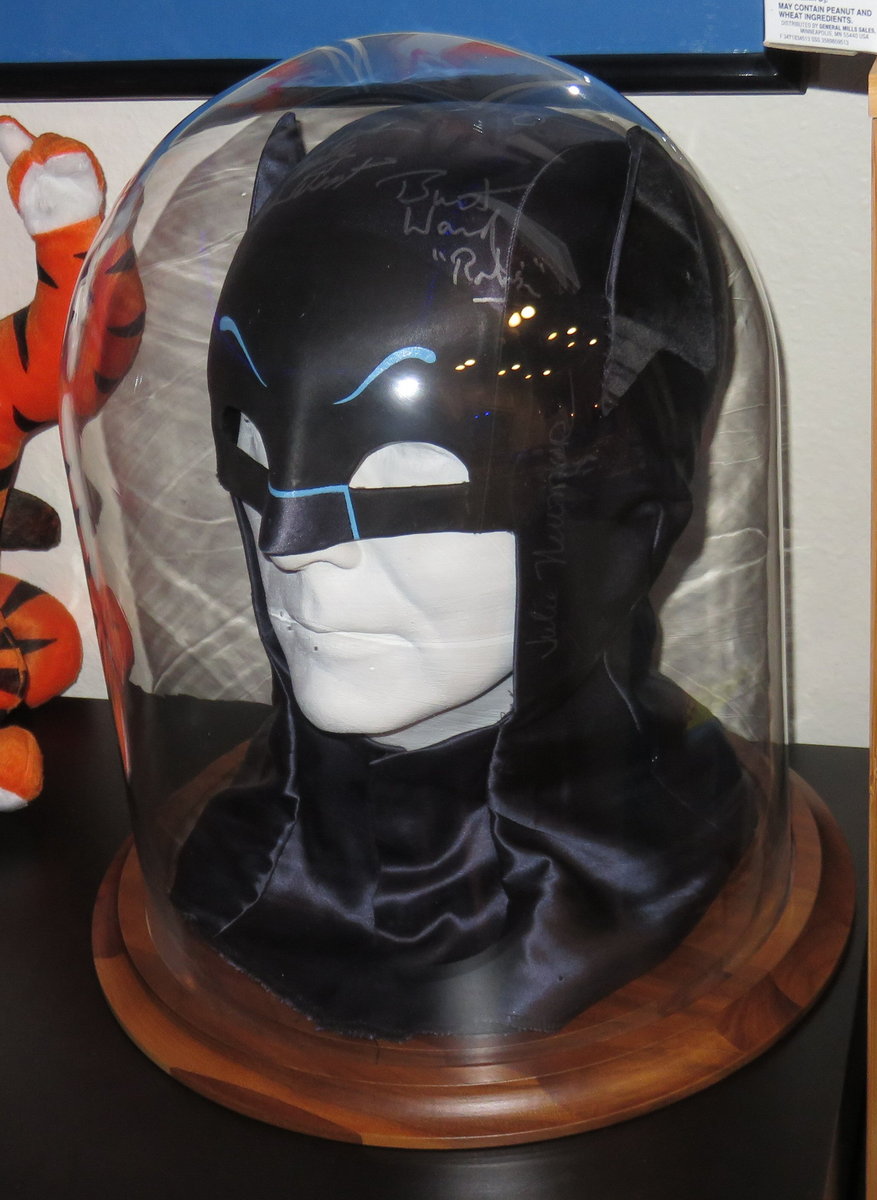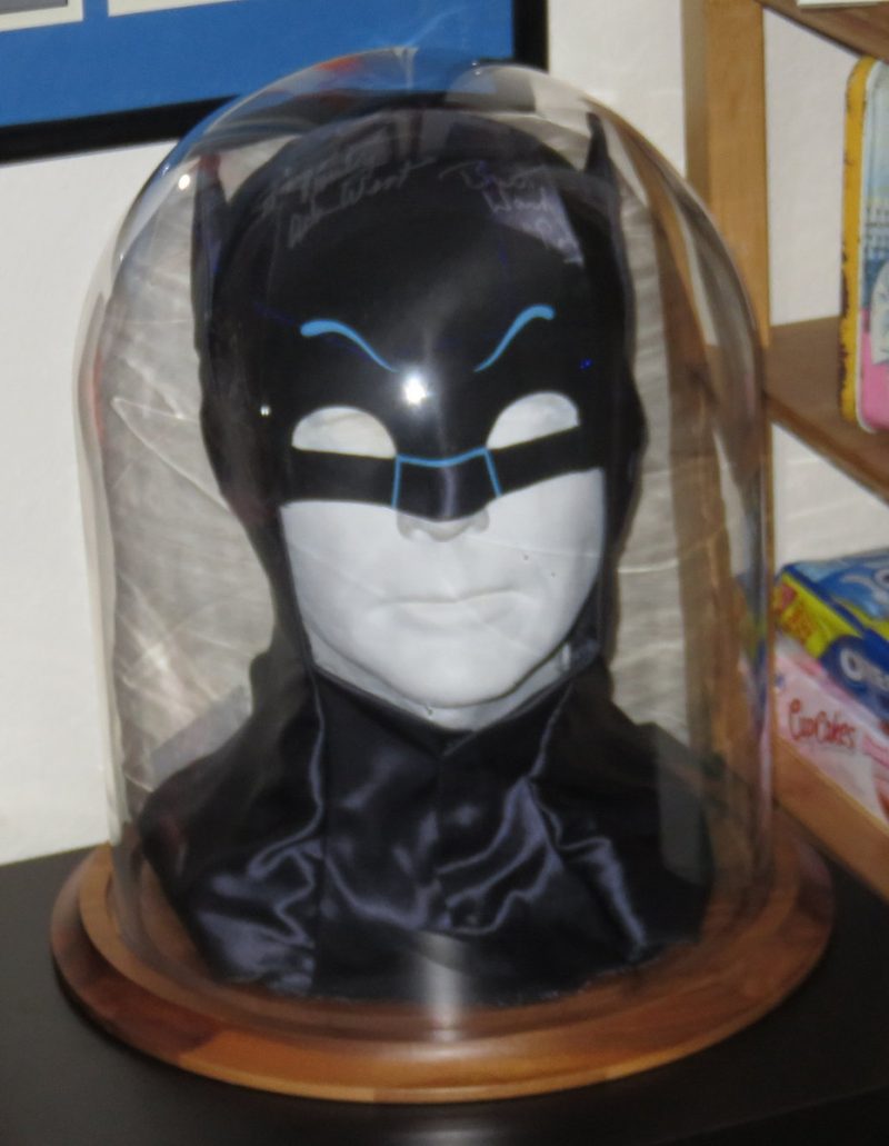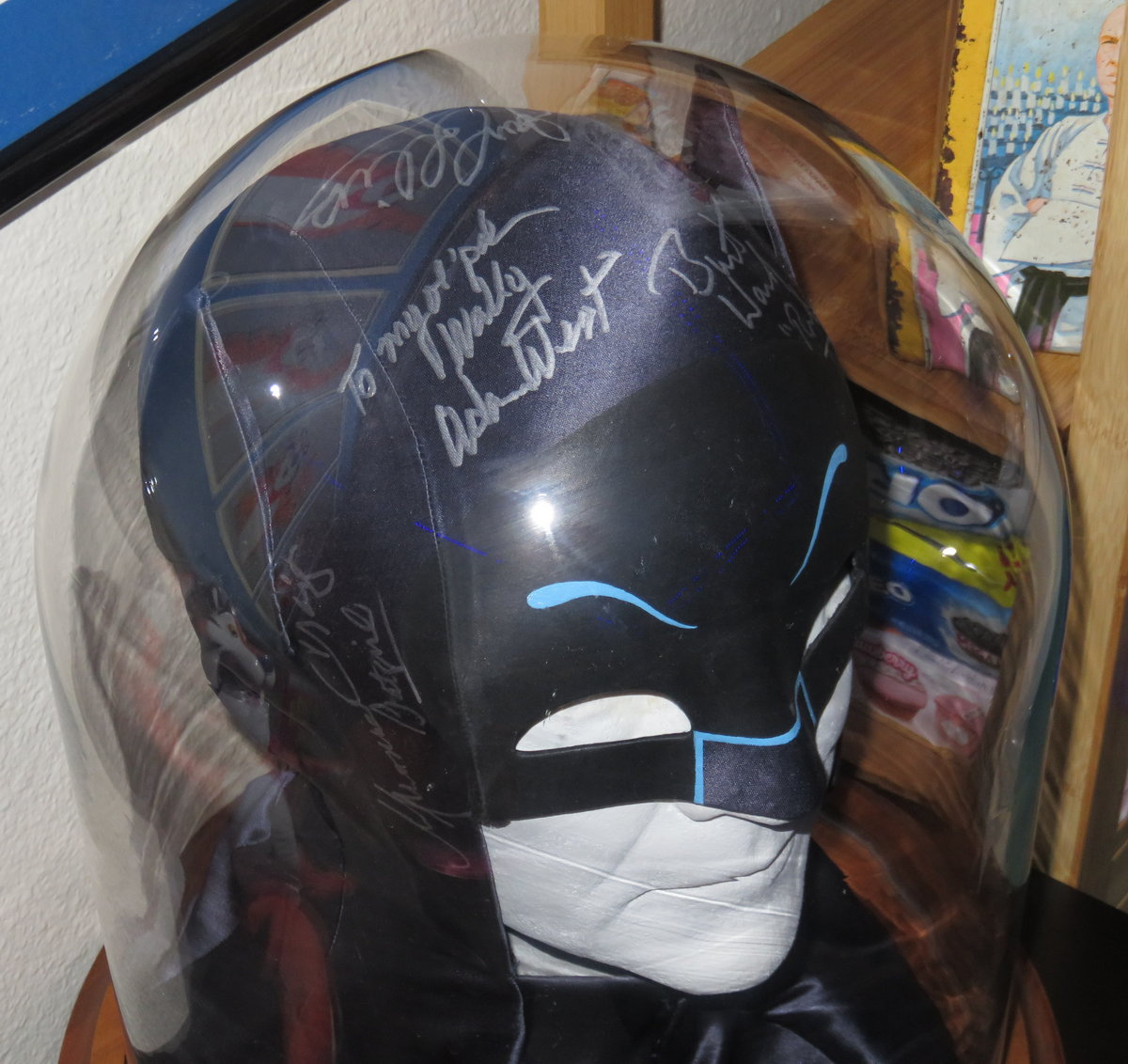 This is the wonderful display dome I bought at Kit Kraft, which fit my signed Batman cowl very nicely. It’s signed by many members of the Batman ’66 cast, including Adam West, Burt Ward, Yvonne Craig, Lee Meriwether, Julie Newmar, Malachi Throne, Joan Collins, and George Barris!