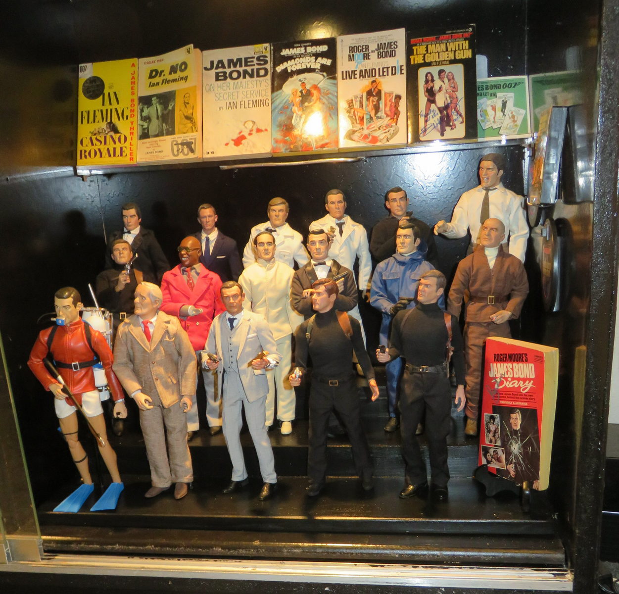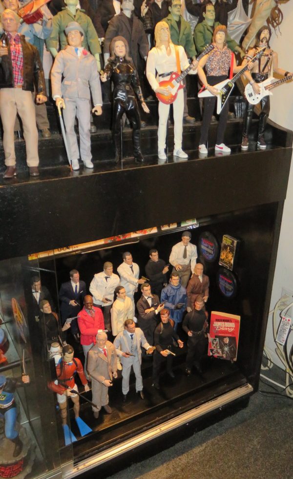 Tuesday the 15th – PLANET WALLYWOOD UPGRADES! – Since I needed a specifically-sized shelf to hold the paperback books in my new James Bond display, I had my pal Kyle at Plastic Depot whip one up. I stopped by his shop in the late afternoon to pick it up. It was the exact dimensions I needed and it was perfect! Custom-made stuff is always best; more expensive, but worth it. Since I was in the neighborhood, I stopped by the Alex in Wonderland shop to drop off some new F3 fleece I had just bought. The other fleece she tried to dye didn’t come out well because of a flaw in the weave of the fabric. Hopefully this new F3 will dye beautifully and we can get the perfect lavender shade we need to get started on The Count replica. I drove deeper into Burbank and hit the Ikea location. I enjoyed a Swedish meatball dinner, and then went shopping. I wanted to buy three more lighted LED head displays for my Muppet caps. These lamps are shaped like a human head, but have a color-changing LED lighting system inside. The lights will change colors, or you can settle on one color. For my four custom Muppet caps that I made, I wanted to have each of them on a colored head display, but each character would have their own specific color. I also picked up a few other items, loaded them into the Gray Ghost and I was on my way home on a VERY warm summer day. I recorded all the auditions I needed to do for that day, and then installed my new custom-made Plexiglas shelf in my James Bond display. I needed to drill a few extra holes for added fortification, as the shelf was a little “teetery.” I added an extra support mechanism under the shelf with armature wire, and it worked perfectly! I moved the Roger Moore figure down from the upper part of the case, and added him to the rest of the Bond figures. To place him next to the other figures, I drilled a hole into the base, put in a T nut, screwed in the support rod, and affixed Mr. Moore to the base. It looked fantastic! I organized everything one final time, cleaned the glass doors, and sealed up the display. Perfect! I dug out my “Spinal Tap” figures from my main showcase (they had been buried so far underneath everything I doubt anyone ever realized I had them) and put them in the three empty spaces on the top of the figure cabinet. I was saving two spots for a forthcoming set of Laurel and Hardy figures, but I was notified last week that the company producing them had gone out of business, and the pre-orders would not be fulfilled. Since I moved Roger Moore down below, I now had three available spaces for figures; perfect for Nigel Tufnel, David St. Hubbins, and Derek Smalls! I posed them and mounted them on the base and they looked amazing! In case the shelf from Plastic Depot didn’t work out, I bought two acrylic display shelves on Amazon a while back. Since the Bond shelf worked out great, I took the acrylic Amazon shelves and put them up in the kitchen to display cereal premiums; the little prizes you used to get inside cereal boxes. I particularly used to love things called “Springies” – which were little figures of Rocky, Bullwinkle, Lucky the Leprechaun, and Underdog that more resembled erasers than anything. But we used to collect and trade them in elementary school. I spent a goodly amount of time looking through my hardware drawer to find the perfect screws to hang the shelves on my wall. VOILA! I found them after an exhaustive search. Once I got the shelves hung perfectly I was ready to throw the box in which they came in the trash. I heard a rattling inside. RATS! The shelves came with their own screws! I completely wasted my time looking for screws on my own! That’ll teach me to search the entire contents of the box when I get a shipment! As I stood in the kitchen admiring the new addition, I heard a rattling that I couldn’t identify. I thought, “Uh oh. What now?!” I opened the blinds to discover that it was rain tapping at my window. IT WAS RAINING! What? I had no idea it was even supposed to rain. But it didn’t last long. Good thing I didn’t go out for my nightly WOG! I finished up writing Wally’s Week, which was delayed a night because my webmaster Scott was out of town. But now that he’s back I spent all night finishing up my material to send to him. Whew! What a busy night!