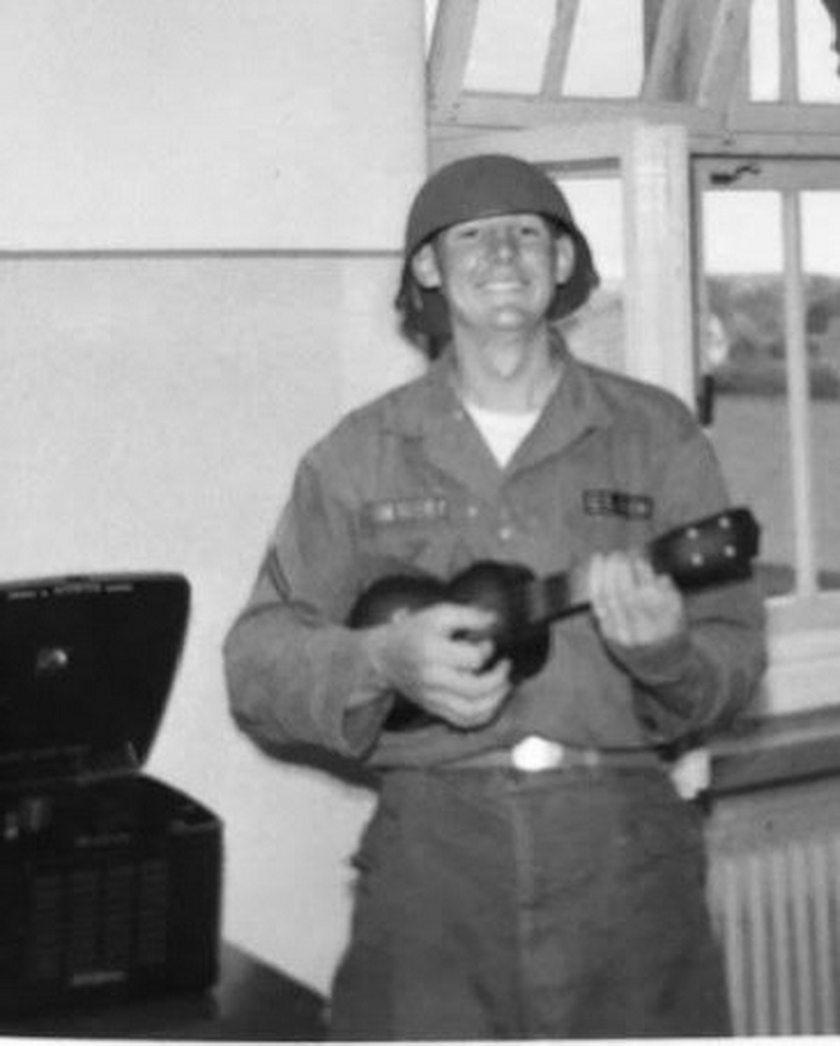 If you’ve been following my adventure with acquiring my dad’s first ukulele, you’ll know that he’s had several ukes throughout his life. He bought one when he was in the Army in Germany in the 50’s, but because of limited space for his luggage he donated it to the Servicemen’s Office so another soldier could enjoy it someday. Here he is goofing around with that ukulele during some downtime.