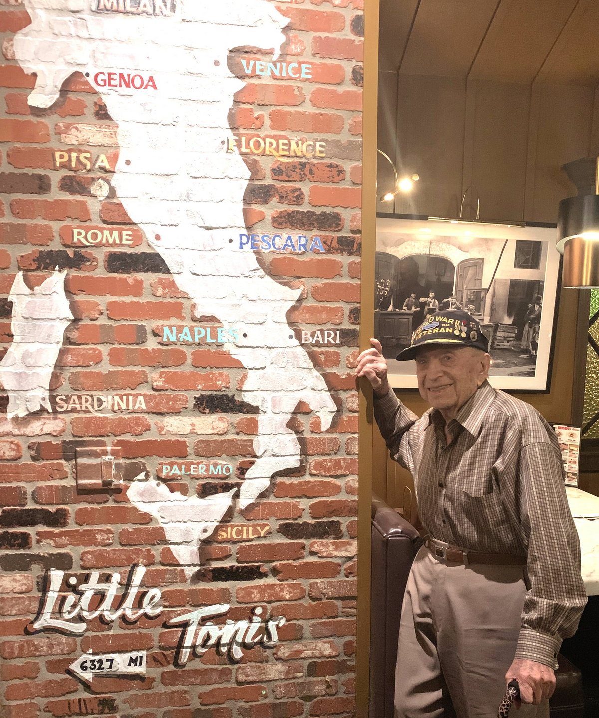 “Bazooka Joe” stands next to a map of Italy on the wall of Little Toni’s restaurant, and points out the city from where his family originated…Bari!