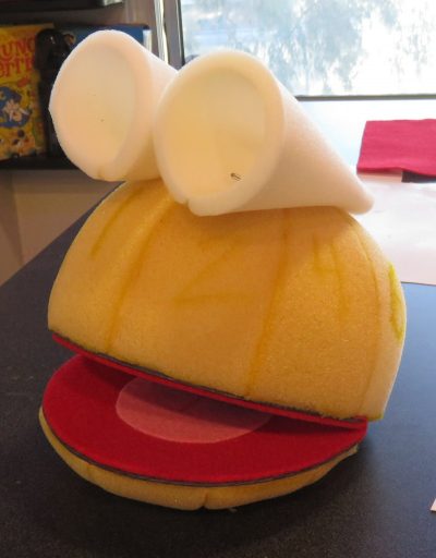 Wednesday the 17th – HEAD FAILURE! – Hungry, I drove to Carl’s Jr. to get some lunch at the drive-thru. Make no mistake, even though it’s considered “fast food” it is by no means inexpensive! The meal I was handed was underwhelming. Overcooked chicken strips (that were mostly breading) and overcooked criss-cut fries. Yuck. I went over to Michael’s craft store to pick up my new framed piece, and it turned out beautifully! I walked over to Studiopolis for a two hour cartoon session, and then I came back home to start working on the head for my new Mahna Mahna replica Muppet. I had an appointment with my seamstress on Thursday, and I wanted to have a head done and ready for her to cover. So I’d be working through the night. I created a pattern for the head and cut the wedges of foam rubber. I got them all glued together, and while it turned out to be a really nice little puppet head, it wasn’t right for Mahna Mahna. So I adjusted it a bit but ended up ruining it for any future use. So I redid the pattern and cut new foam wedges. I received the final video segments I needed to complete the little Muppet video project we were doing for a kid in South Dakota, and I took great delight in editing them into the final video. Then I grabbed a short nap. Later I recorded my nightly auditions, and continued working all night on my Mahna Mahna replica Muppet. I got a lot of great work done on him, but as I finished I noticed it was dawn. When I’m working on a puppet the time just flies! It’s certainly not the first time I worked all night on a puppet!