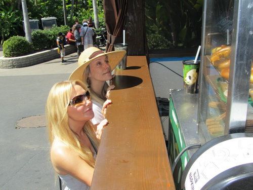 Friday the 26th – SOMEONE TOLD ME IT’S ALL HAPPENING AT THE ZOO! –We got to the world famous San Diego Zoo and had some lunch. So many funny things happened today it’s hard to remember them all. First, we got on the skyway and took a bird’s eye view trip over the entire zoo. As we were sitting down on a bench looking at the map to see where to go, I looked up and saw an older guy with his grandchild. He was hunched over and his arms bowed out a bit. He pointed ahead and said to his grandson, “Hey look! Monkey Trail!” I laughed and pointed him out to the girls. He was walking like a monkey and didn’t even know it. OF COURSE he’d want to go to the Monkey Trails. He waddled off and we laughed that he might have been going to see some relatives. We got into one exhibit and a couple with two kids came up to see. In a high-pitched, perfect British accent, the little kid (who couldn’t have been more than 5) said, “Is that a roi-no? A tay-pee-ah?” He was looking at a Tapir, but the sound of his perfect little British voice made me laugh. We enjoyed watching the Squirrel Monkeys for awhile, and I talked to something called a “Go Away Bird,” which sounded like a duck. I would quack, and he would answer back in his little quacky voice. Speaking of ducks, we saw LOTS of them! THAT’S where they were! The moved from Seaport Village to the zoo! We saw some rhinos nuzzling, and we saw a monkey grabbing some brightly colored biscuits and swinging down to the water hole to soak them. We watched him gently place them in the water and leave them in for awhile, as if he was some sort of simian chef making a gourmet dinner. When he figured they were soaked to perfection, he took them out and gently laid them on the grass to dry in the sun just a bit. We referred to him as the “Chef Monkey.” Amazing! We had walked the entire zoo but hadn’t seen giraffes yet! Good thing too, because just as we walked up to the giraffe exhibit we noticed that it was getting close to feeding time! For a few bucks, you could buy little trays of those brightly colored biscuits we saw the monkey soaking, and feed them to the giraffes! I was IN! I got enough biscuits for Brittney, Edi and I. The attendant said that we first needed to sanitize our hands, then feed the giraffes the biscuits by gently placing them on their tongues. Then we could wash off our hands in the sink afterwards. So the plan was that the girls would sanitize, then feed the giraffes while I videotaped, and when they had their hands washed they would take the video camera from me, I would sanitize and then feed the giraffes while they videotaped me. Luckily the zoo had a staff photographer there to get shots of us all feeding the giraffes. They’re so gentle and elegant! It was amazing! We grabbed a snack and did some last minute shopping. What a fun day at the zoo! We headed back to the hotel, and then went to Seaport Village to grab dinner. Gladly, there were a lot of ducks there and I took great delight in feeding them, as is tradition. We grabbed some italian food and then went back to the hotel for a dip in the jacuzzi. It started out alright, but then about 5 six year olds came into the jazuzzi. Edi, Brittney and I had had our fill of being with kids and we were a little disappointed. Why oh why does the 21+ pool close so early?? Luckily the parents came over and saw that the jacuzzi was mostly filled by adults who didn’t seem to want youthful company, and they took the kids out. But then three drunks came by and one guy stripped completely naked and tried to jump in the pool. Good thing the kids were gone! But he was so drunk he slipped as he was trying to get his pants off. I hid my eyes, and Edi was too low in the jacuzzi to see, but Brittney stood up to watch and relayed the entire thing. Too funny! But two amazing days walking around in the hot sun had started to get to us, and we were getting quite tired. So we called it a night and headed into the hotel to sleep. I was still laughing about the sea lion and the little kid!