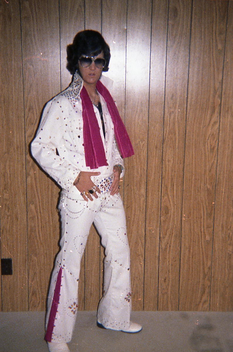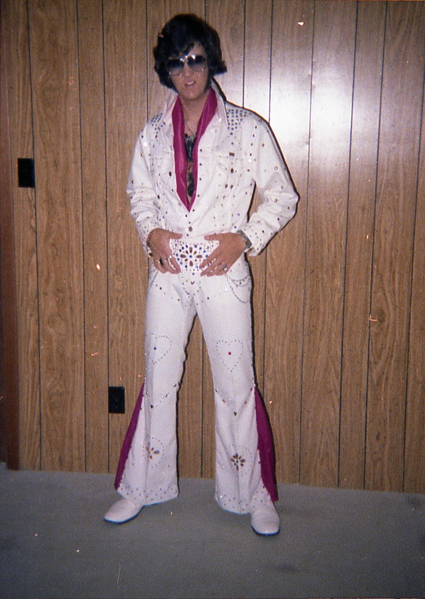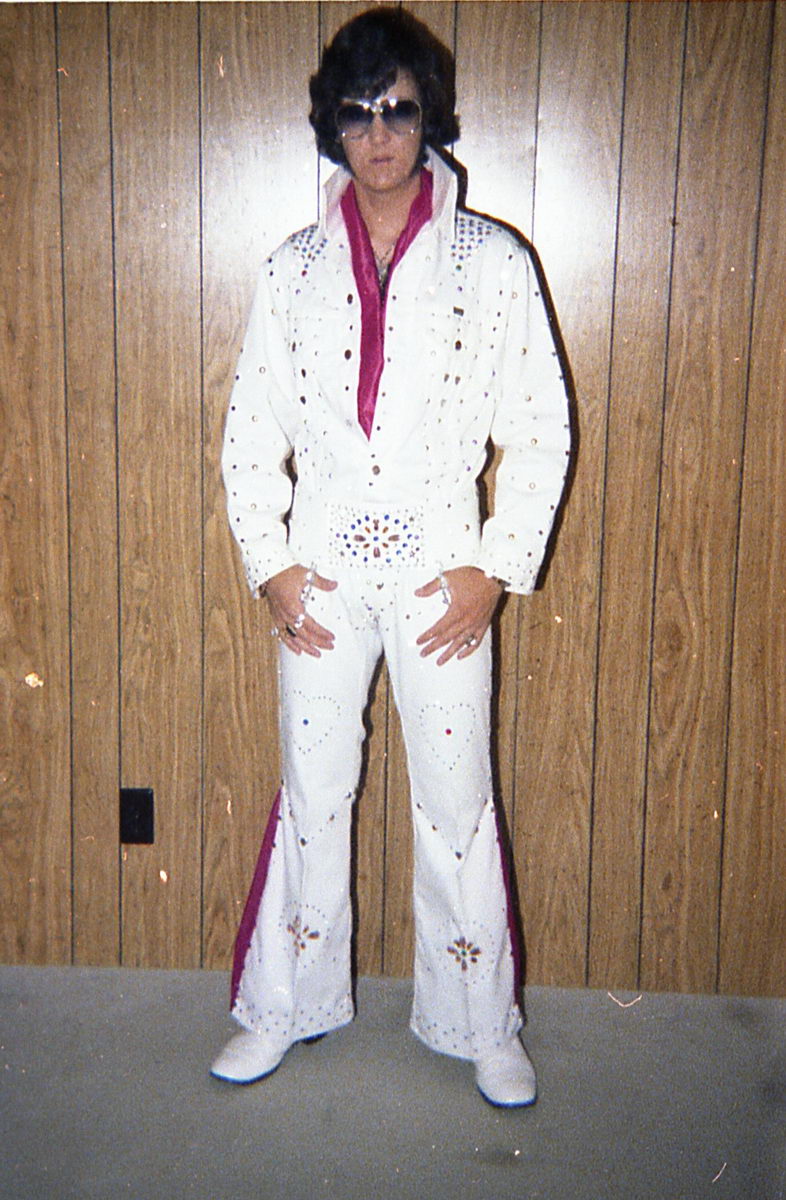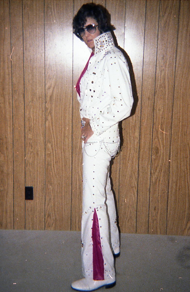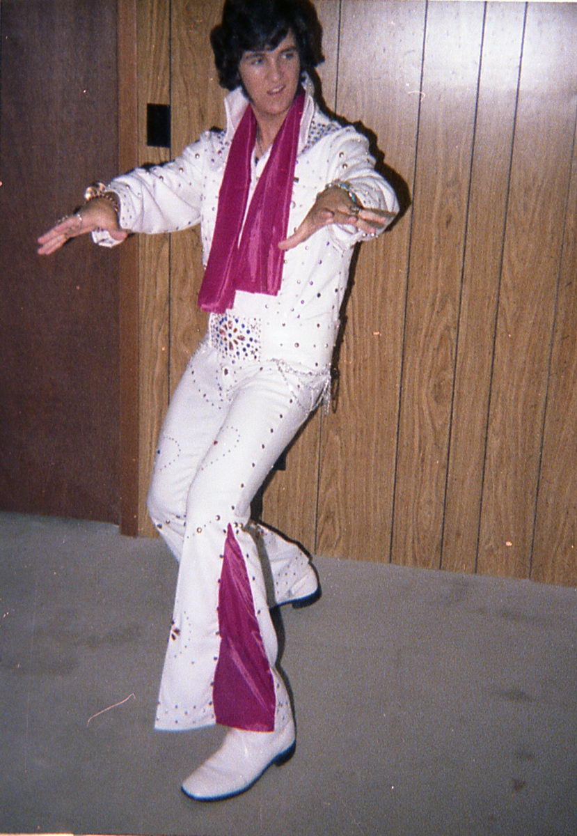 When I started thinking about doing an Elvis act for the talent show in the following school year, I couldn’t decide between Elvis ’56 and Elvis ’72. So I had my dad take some more costume tests.