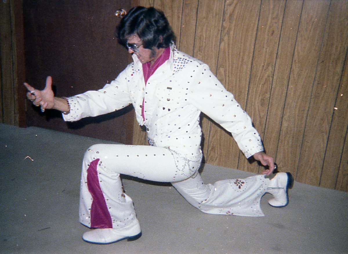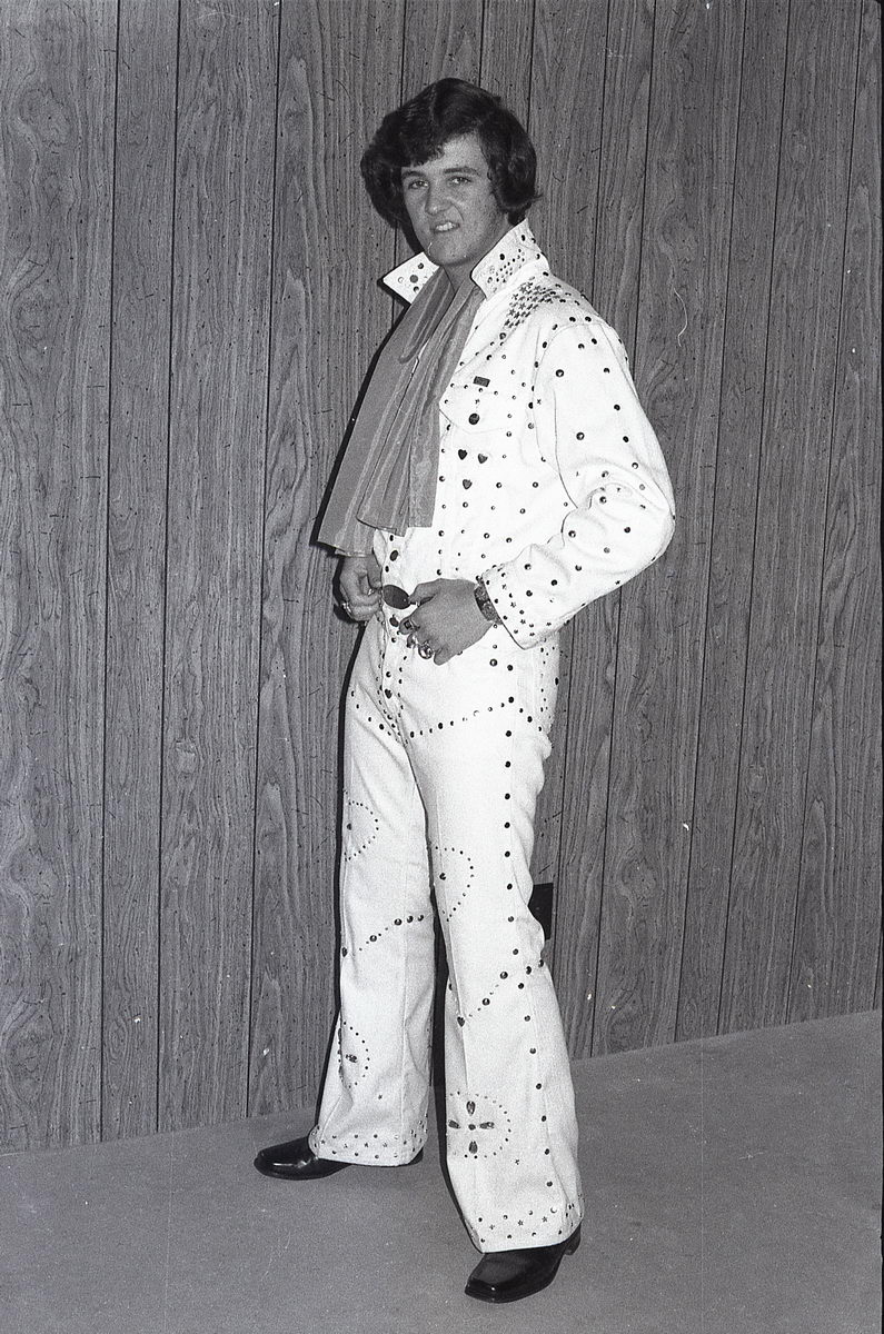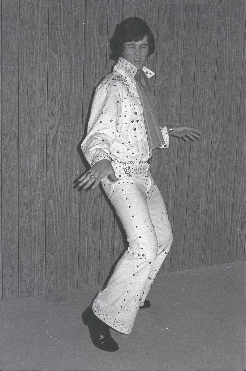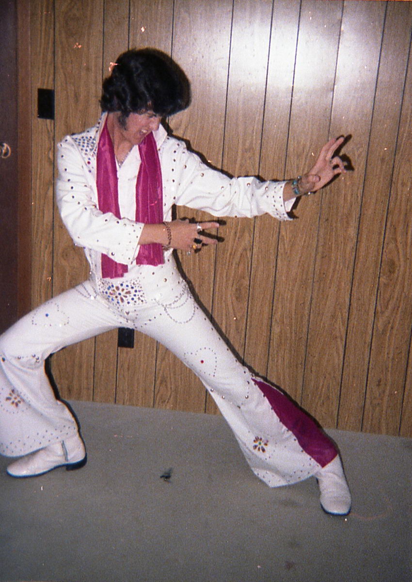 When I started thinking about doing an Elvis act for the talent show in the following school year, I couldn’t decide between Elvis ’56 and Elvis ’72. So I had my dad take some more costume tests.
