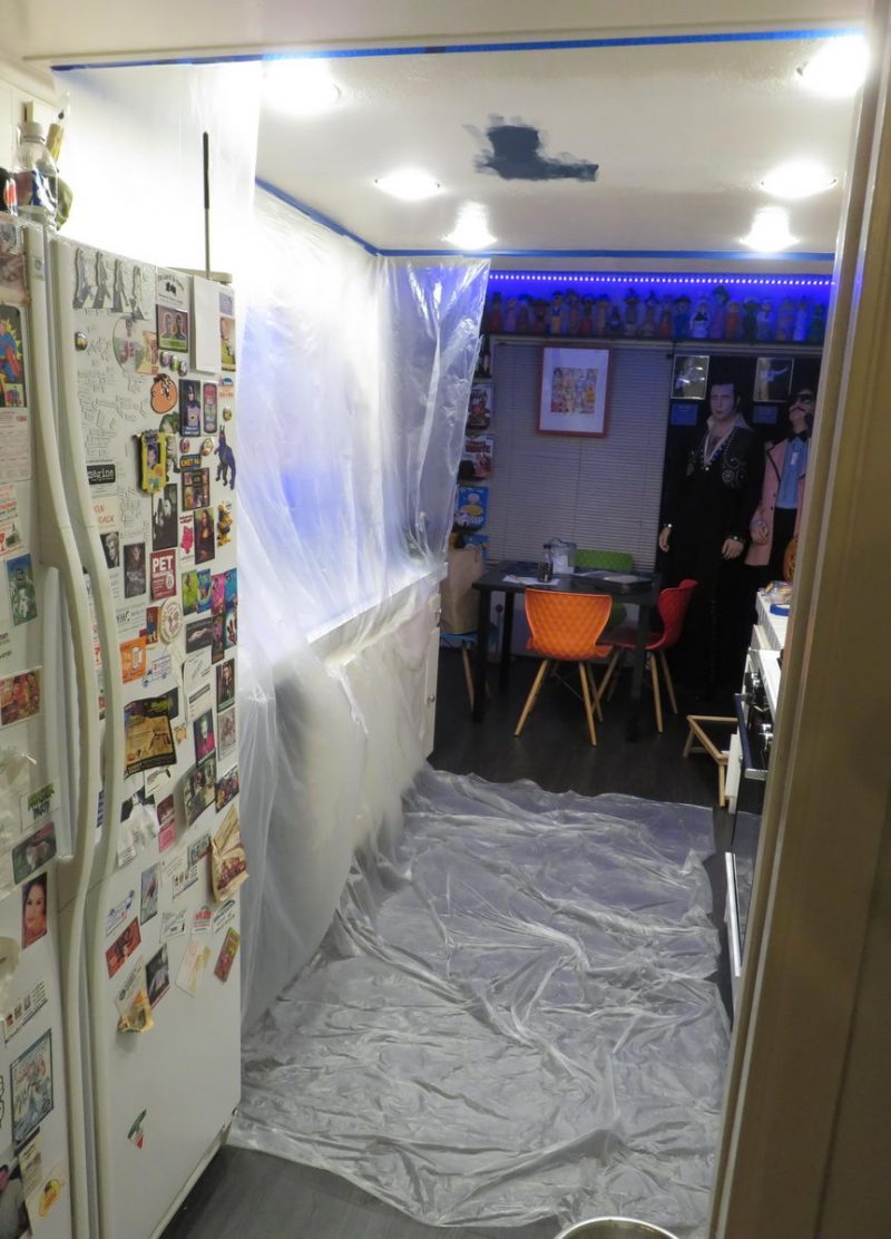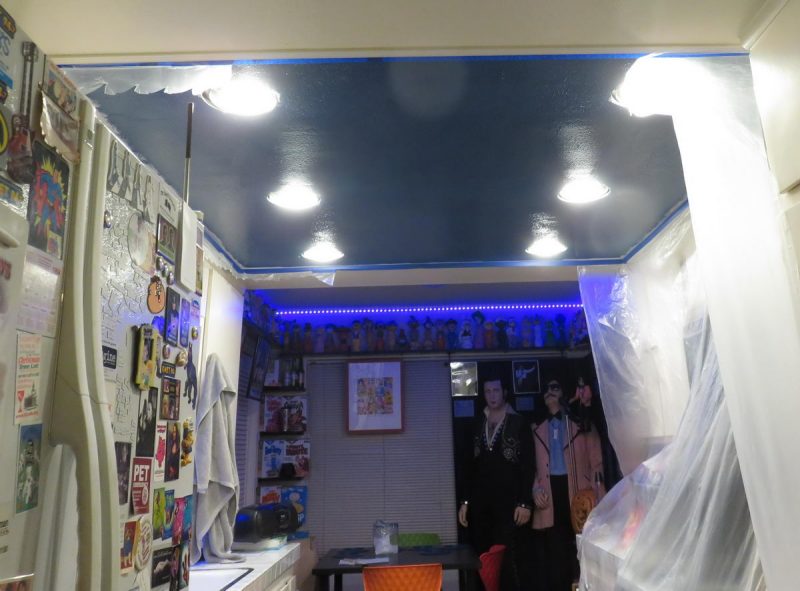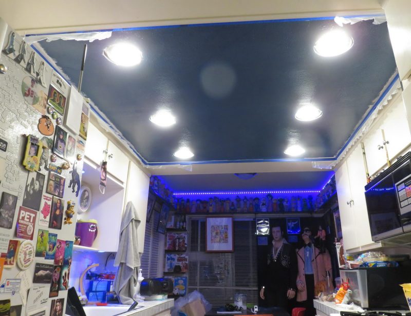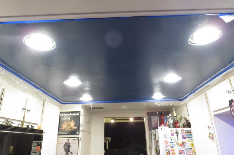 Saturday the 19th – ROOKIE MISTAKES! – Nothing helps me think better than a full stomach. So I ordered a Domino’s pizza and started plotting out how I was going to paint my kitchen ceiling and create my “star window.” I started by putting tape all the way around the section which is framed by molding. This would allow me to paint the ceiling deep blue, without getting any paint on the white molding. Then I spread out the plastic drop cloth. But the drop cloth wasn’t big enough to accommodate the amount of space I had in mind. Drop cloths are made for those who are painting vertical walls, so they’re not exceptionally wide or long. I needed a drop cloth that could be attached to the ceiling, run down the length of the kitchen cupboards, the counters, across the floor and back up the other side across the counters, the cupboards, and attach to the ceiling. Since I only had about half as much as what I needed, I decided to paint half of the ceiling, and then move the drop cloth to the other side to complete it. Rookie Error #1 – measure out the amount of drop cloth you’ll need. I gently dipped the roller in the tray and tried to squeeze out as much excess paint as possible, while still giving me enough to cover a certain amount of area. I didn’t want a soaked roller splattering paint everywhere; all over me and the kitchen – even though I did have a drop cloth down. All went pretty well, but I realized Rookie Error #2 – I should have cleaned the ceiling well with alcohol and a paper towel to remove any residue. I cleaned the little metal rings which go around the lighting fixtures thoroughly in order to get the paint to adhere, but I should have cleaned the ceiling as well. But it was all going on pretty well, and THANK GOD – there were no “Laurel and Hardy” moments; with me getting clumsy and spilling paint everywhere. I remember the days when my dad would paint around our house, and the smell of the oil-based paint and the turpentine thinner you needed to use to clean the brushes. UGH! But no longer. Everything cleans up nicely with water now. This is the type of job my old pal and contractor Terry used to love doing, but he’s been gone now for many years. I always think of him fondly when doing something like this, and it’s not uncommon for me to yell out, “Terry! What should I do?” Though I covered the majority of the area with a roller, I needed to paint the edges with a corner brush. This would allow me to do the edges neatly and cleanly. I was assisted by all of the blue masking tape that I put up earlier. I painted all around the edges with the edge brush and was pretty happy with my work. But then – Rookie Error #3. I should have taken the tape down immediately after I painted the edges. Because when the paint goes on the edges, it also slops over on the masking tape, which is the whole point. But if you remove the tape AFTER the paint has dried, then you end up pulling off clumps of paint along with the tape. The paint on the tape and the paint on the ceiling joins when it dries, and pulling off the tape after it dries rips sections of the paint on the ceiling. So now I’ll need to retape it all, repaint the edges, and take the tape off right after I’m done to prevent this from happening again. I’ll also take a small, flat paint brush and touch up the edges at the transition line between the molding and the ceiling. I can also use a razor blade to gently scrape off any blue paint and create a nice clean transition line. These are things I learned and will be aware of the next time I do something like this. I made my traditional Saturday Night Super Saint Salad and watched another episode of “The Saint” from the first season DVD set. It featured Shirley Eaton, who is best known as the “golden girl” in the movie “Goldfinger”! It was neat seeing a future Bond girl, with a future James Bond.