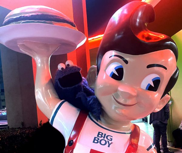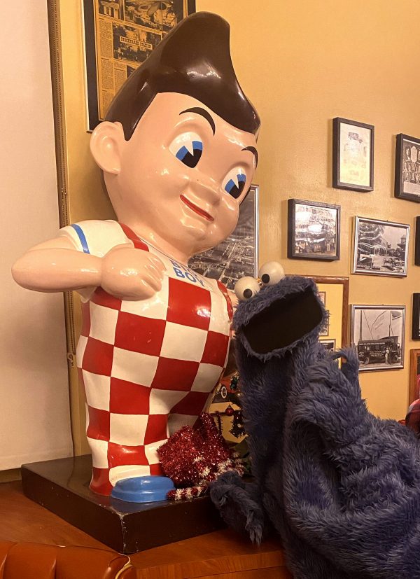 Saturday the 21st – CHRISTMAS “COOKIE!” – Since Angi’s plane wasn’t going to leave until 11pm, so she could go see her family for Christmas, she stopped by so we could go grab a quick bite to eat. She wanted fries and a shake at Bob’s Big Boy, but before heading out I asked her if I should bring along my “Travel Cookie” (my Cookie Monster replica that I can take out of the house for fun). She thought it was a great idea, and we could get some pictures with him at the restaurant! It was a great time. We got some wonderful pictures next to the Bob’s Big Boy statues. But I was interested in stopping by the new Randy’s Donuts location in the area to get a few donuts to go. The ladies behind the counter remembered Angi and I from a previous visit last summer! We started talking about all sorts of stuff, and we got on the subject of Christmas plans. One of the ladies said she’d be going to visit her 3 year old niece who was crazy about puppets. I asked her if she was into Cookie Monster, and I was delighted when she said she was! I traipsed off to the car and brought in the black plastic bag that contained “Travel Cookie.” I told the lady to get her phone out and we’d shoot a Christmas video for her niece. It turned out really well, and it was fun hearing the other people in the dining area laugh at all the jokes. I also invited her and her niece over to Planet Wallywood for a tour. I told her she would really enjoy seeing the Puppet Room. In the car on the way back to my house I told Angi that early exposure to puppets could set the kid on a course for a lifetime interest in puppetry! After all, it was my great-grandpa who planted the idea in my little head! After Angi took off to catch her Uber to the airport, I got on the phone with my computer guy Brian, and we worked on solving a few issues I was having with my back-up program. Later I took my nightly WOG, and worked on my computer the rest of the night.