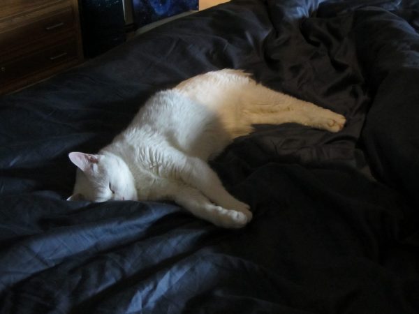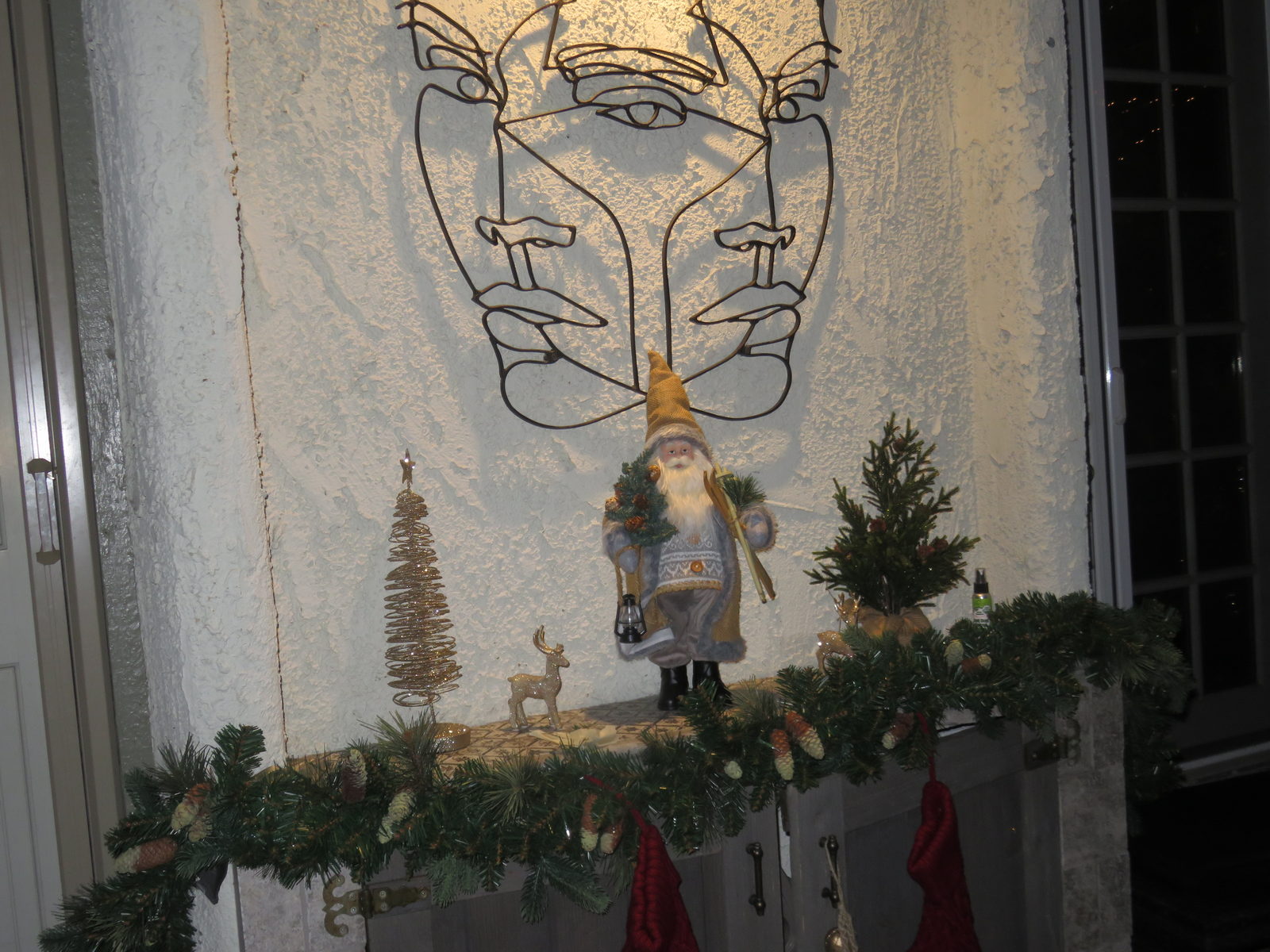 Saturday the 23rd – PHOTO PHINISH AND HAIR HUE! – When I set my alarm to get up for my hair appointment with Andie I gave myself just enough time to get a shower and walk over to her shop. But when I got up I had gotten a call from Harry’s Camera that my new batch of photos had arrived and were ready to be picked up! So I dashed into the shower and hopped in the Gray Ghost to go get them. I wanted to have them for my “Creative Christmas” project on Sunday night! Then I headed to Andie’s, got a touch up on my color, and then headed home. My pal Amanda was in town so she dropped by with a little Christmas gift, and then I posted some more Christoween videos for Christmas Eve day. I took my nightly WOG under a mostly-full moon, and then spent some time in the anti-grav chair enjoying the quiet, semi-cloudy night. It was very relaxing watching the moon play peek-a-boo with the clouds. I came back inside and made my traditional Saturday Night Super Saint Salad and watched an episode of “The Saint.”