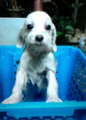 Just before my friend Edi brought her dog Bunny over to my house for movie night Saturday night, little “Bun Bun” got a bath. And she doesn’t look the slightest bit happy about it!
