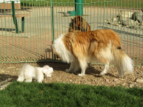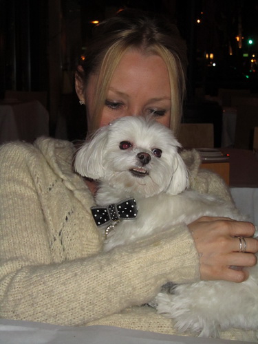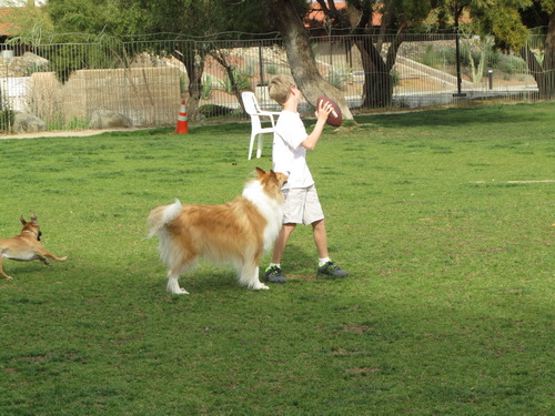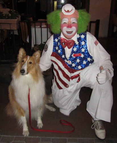 Saturday the 16th – ROXY’S FIRST PALM SPRINGS DAY! – We got up around noon and Edi and I drove the dogs to a dog park near the Palm Springs airport. It’s a huge park, very nicely designed. They both loved it! Roxy wasn’t sure what to do at first, but quickly got the hang of it. Though Bunny is small, she takes charge right away and keeps the other dogs in line. Roxy saw two boys playing football with their mom and joined their game. She would stand in front of the boy with the ball and bark wildly until he threw it. When he did, she chased it to the next person. She was having a blast. In fact, she got tired out pretty well! I knew there had to be some way to help her spend some of that pent-up energy! I got a call from my pal Adam West with a time to meet with he and his wife Marcelle for brunch the next morning. Edi and I took the dogs back to the hotel and walked down to Ruby’s Diner for lunch. Palm Springs is VERY dog friendly, and the stores along North Palm Canyon Drive sometimes will have bowls of water outside for passing canines. Between Bunny’s tiny cuteness and Roxy’s royal beauty, Edi and I got stopped a lot by dog lovers along the way. One more thing to adore about this amazing town. We went back to the hotel and the dogs were OUT! Between the dog park and walking the street, they’d had enough for now. So I took advantage of her exhaustion and slept for a little while myself. I woke up around 9 and then hit the jacuzzi. Then it was back inside to get the doggies ready to go find a later dinner. Most of the places we wanted to go to had closed already, but we did find one italian place next to a karaoke bar. We were sitting out on the patio listening to horrible karaoke singers and laughing ourselves silly. But a few singers were good. A guy did “Your Song” by Elton John, and another guy did “God Bless the U.S.A.” by Lee Greenwood. They were pretty good. But after about an hour I commented to Edi that so far we had only heard songs from the 70s and 80s. You know what was missing? Songs by Bieber, Gaga, Beyonce, Miley, etc. Apparently when the young crowd want to have fun singing karaoke, none of the modern day music is good enough for them. Go for the classics! “Bohemian Rhapsody,” “Pour Some Sugar One Me,” “Don’t Stop Believing,” etc. You can’t beat the classics! I didn’t think we’d see him, but sauntering down the sidewalk was our old pal Harpo the Clown! It was good to see him. Though he doesn’t talk, he indicated that he had just been thinking about me about 15 minutes earlier. STRANGE! I headed back to the room to feed Roxy and get her settled for the night. We had to get up early for brunch so we couldn’t stay up too late. But while I was enjoying my balcony time, Roxy came out and joined me. She laid right by my feet and passed out. We both slept very well that night!