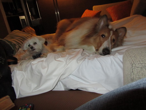 Friday the 15th – A QUICK WEEKEND AWAY! – I got a hotline call from “TTS” to record a bit, so I got out of bed and recorded it and sent it in. Then I went back to bed, but got another hotline call soon after to record another bit. I sent that one in and then went back to bed to cuddle with Roxy for awhile. Then I got my walking clothes on and walked Roxy over to the groomer’s to get a bath. We had a great weekend away planned, and I wanted to make sure she was clean for the trip. I came back home, cleaned up and headed to NBC. I grabbed a tuna sub at Subway on the way. For the first time in the three years I’ve been at “TTS,” they had some technical issues during the show. Some of the computers weren’t behaving properly, but the amazing team pulled it together splendidly! Top notch! My friend Carolyn was at the show with her friend Tina. Carolyn and her pal Laura are the ones producing the Starsky & Hutch convention on April 6th that I’m emceeing. David “Hutch” Soul is busy restoring a car that once belonged to Ernest Hemingway, so it was fun to get a chance to talk to Jay in the hallway about the project. I’d love to get David and Jay together for a few minutes to exchange ideas and advice. Carolyn told Jay about the project and Jay seemed intrigued. I dropped the ladies at their car and then headed to the hardware store to buy a heater to take with me on my trip. Then I went to pick up Roxy at the groomer’s. I talked to Terry, the owner of Rusty’s Discount Pets for a bit. Then I ran into an old pal of mine from church and we chatted for a little while. I drove home and got Roxy’s stuff packed up (I was already packed!) and we waited for Edi and her dog Bunny to pick us up. We were headed to Palm Springs for the weekend! Sara came over to housesit for the weekend, and then Edi arrived. We barely got all of the stuff loaded into Edi’s truck, and we headed out. Roxy was nervous about getting into the car. But I lifted her up and we went on our way. Some luggage had shifted in the car a few blocks away, so I pulled over on Lankershim Blvd, one of the busiest streets in L.A., and when I opened the back door something told me to grab Roxy’s leash. Sure enough Roxy darted OUT OF THE CAR! Good thing I had a hold of her, otherwise she would have most likely run in front of some traffic. I think she thought she was going to the vet or something, because she was panting nervously and drooling all over her dog bed. As we got down the freeway she settled down a little bit. Traffic on the 210 was pretty bad, but once we hit the 10 East it was smooth sailing. We got to Palm Springs around 11, got some food to go at Denny’s, and then headed to the hotel to check in. Edi and I took our dogs for a walk, and then I went upstairs to get Roxy settled and feed her some dinner. I was looking forward to getting out on the balcony of my room and watching stars all night. I believe that relaxation should appeal to all six senses. 1) Sight – I love staring at the clear Palm Springs sky and watching the stars, shooting stars, and any birds, bats or owls that may fly over. I also love “watching the Earth turn.” I keep my eye focused on a bright star near the horizon of the mountain range in front of me. I stare at it as long as it takes to watch it eventually disappear behind the mountain. It’s there, it’s there, it’s there…then all of a sudden, POOF! It’s gone. And I just saw the movement of the Earth. Amazing! 2) Sound – I have a special Palm Springs playlist on my i-Pad that I listen to while I relax. It’s music I have that’s appropriate for the mood. It’s diverse, and moving. 3) Taste – I love eating some fresh-popped Jolly Time Blast ‘O’ Butter popcorn (which is why I bring my microwave with me all the time) and drinking an ice cold Coke in a glass bottle while I relax. 4) Touch – Feeling the clean, warm Palm Springs air while I relax is in itself refreshing. Though it’s not that warm at night yet in Palm Springs (it was 50, but I prefer 64) I put on my big, cozy white robe and enjoyed being surrounded by that for awhile. 5) Smell – I always light a scented candle and have it burning in my room while I relax on the balcony. That plus the smell of the fresh desert air is extremely pleasant! 6) Spirit – I don’t know if it’s because there are Native American burial grounds nearby or what, but Palm Springs seems to be a highly spiritual place. It seems like everyone’s sprits are at peace there, and the sense of the spirit is always appeased during my relaxation/meditational visits to Palm Springs. But Roxy was still very unsure of what was going on. She was a little restless and was pacing around the room. But it had been a long day and I was getting tired, so we hit the hay. I had to wake up several times to settle Roxy down. But she’ll get the hang of it.