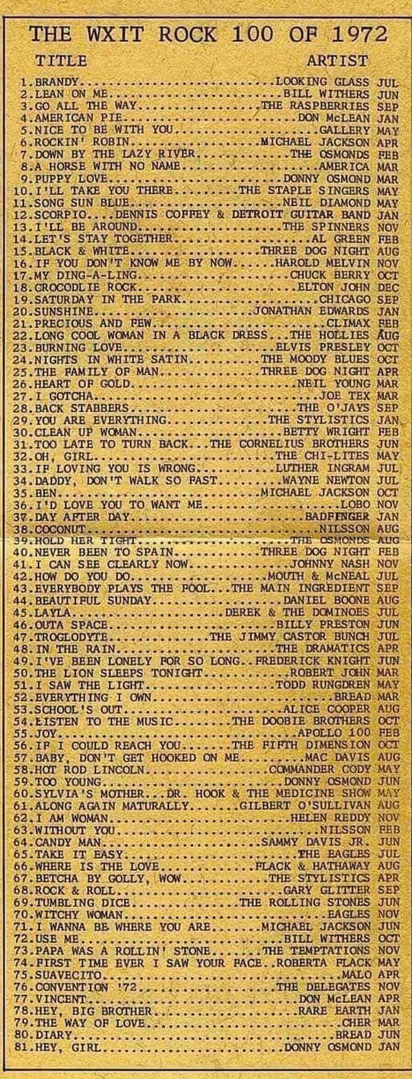 Since this week’s Wally’s Week took on a very nostalgic vibe, I figured I’d also post this list I found of the top songs of 1972…a banner year for music! Just look at that #1 song of the year!!!