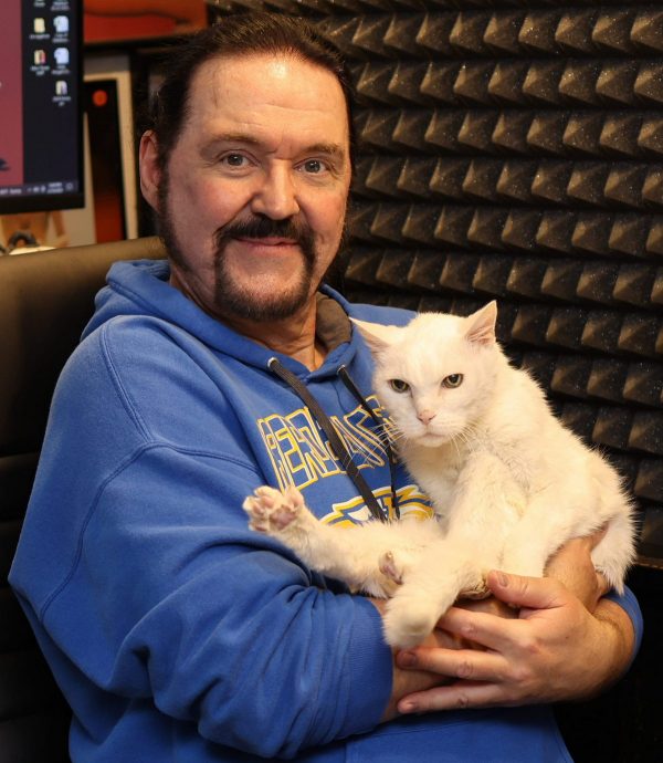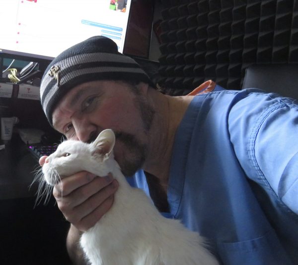 I’m never too busy in the home studio to miss giving a kiss to 19.5 year old Spooky the cat!