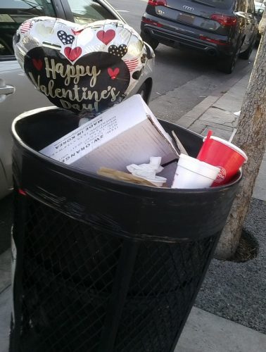 On my walk I saw this sad sight…a still-inflated Valentine’s Day balloon and gift set very unceremoniously dumped in a trash can. I guess the recipient didn’t like it very much.