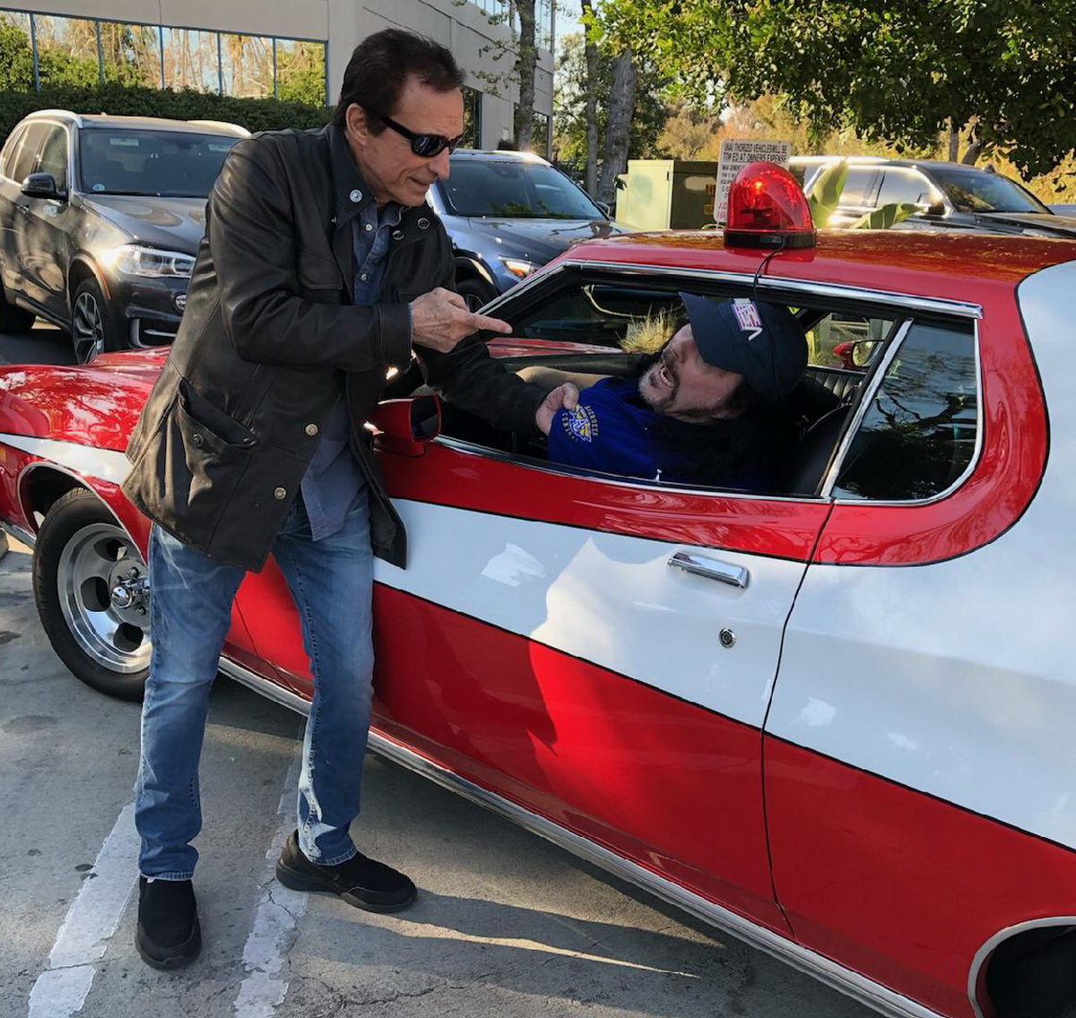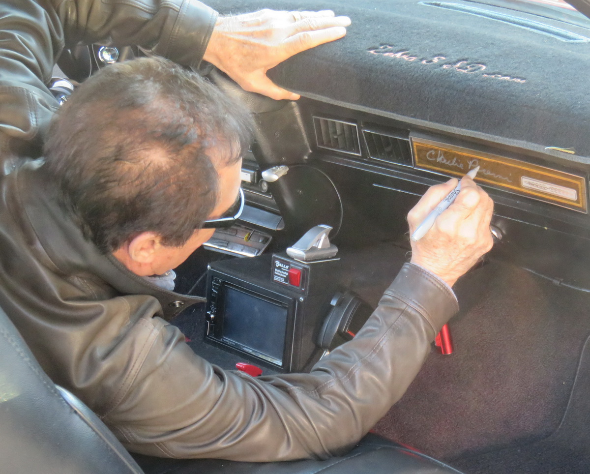 Thursday the 6th – STUNT STARS! – At 1 I drove the Gran Torino over to Jerry’s Famous Deli to meet with a few stunt legends, Justin Derosa and Charlie Picerni. Charlie is one of the great stuntmen of our generation, but has also acted and directed in a bunch of projects. But to me, he’s mainly known as the stunt driver of the Gran Torino in the “Starsky & Hutch” TV show! When I was driving my Torino through a parking lot last week to get some groceries, I spoke with a guy who commented how much he loved my car. Come to find out his name was Justin Derosa, a stuntman, who knew Charlie very well. He said that Charlie was coming to town that weekend to do some work in a few TV shows. He asked me to join then for lunch so I could show Charlie my car! We had a fun 2 hour conversation, and then the surprise! Charlie was blown away by my Gran Torino. We got some fun shots with him in it, and he even signed the interior of my car! I drove over to my seamstress Shelley’s house to give her my leather cap and a bunch of green Oscar fur so she could get started on making my Oscar the Grouch baseball cap! It will literally look like Oscar is sitting on my head, similar to the Rowlf the Dog cap I made last year. I came home for a nap, and then met my friend Helen so she could fill out corporate paperwork so she could start doing assistant work for me in the future. I did a little more work on Oscar, prepped for my meeting on Friday, made some lasagna, walked Roxy, and then headed for bed.