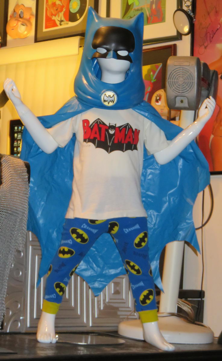This is my Batkid mannequin display that features the 1966 Ideal Toy Batman cape and helmet set, as well as a 60’s vintage child’s shirt with the Batman logo on it. While I didn’t have the helmet and cape set as a kid, I got a t-shirt exactly like this one for my 5th birthday!
