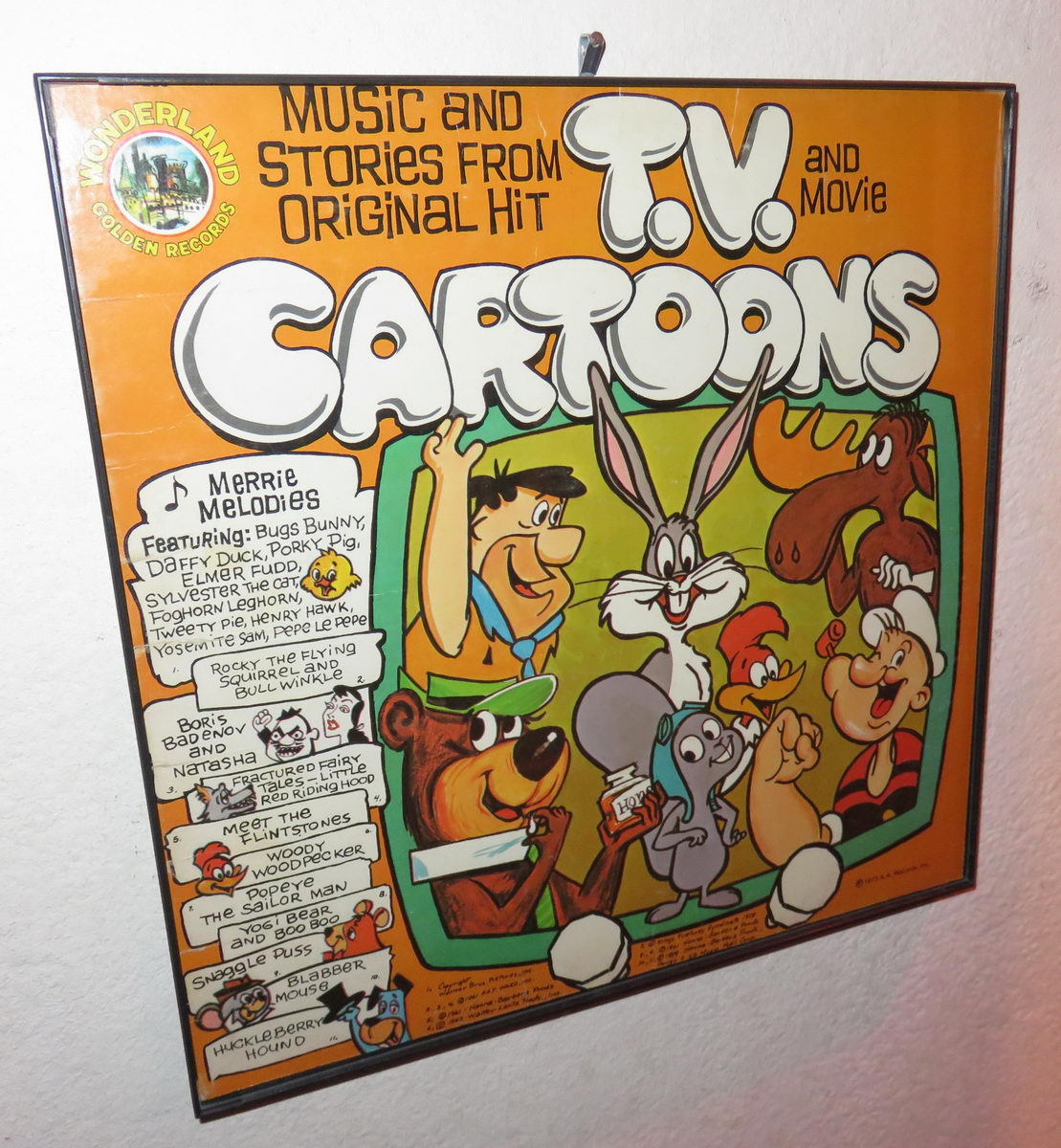 Here’s the framed cover of the Cartoon Themes LP I recently got. Upon closer inspection of the artwork, I noticed a few mistakes that slipped by the graphic designer. First, the famous scented Warner Brothers character is Pepe Le Pew, not Pepe Le Pepe. The artist must not have been a Warner Brothers cartoon fan, because the character featured in the Merrie Melodies section is Yakky Doodle (a Hanna-Barbera character), and not (at the time) a Warner character.