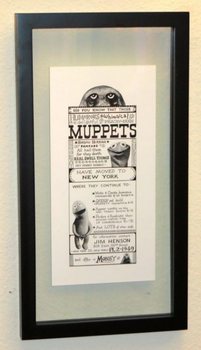 Wednesday the 10th – A REAL PANE IN THE GLASS! – The first stop of the day was to Dee’s Flowers, next to my church. I pre-ordered Valentine’s Day flowers for my friend Michelle who would be coming to town this weekend. Her favorite Muppet movie is “Muppet Treasure Island” and I had a Kermit “Treasure Island” finger puppet in my collection. I brought the puppet over to Dee’s so they could put him in with the bouquet of roses. I’m going to print up a comic balloon with the words “You’re a treasure!” to mount next to the Kermit puppet in the bouquet. If you remember from reading Wally’s Week around Christmas time (Michelle’s birthday is 12/26) through a series of circumstances she ended up with 14 roses – setting up our personal tradition of 14 roses every time I get her flowers. So I ordered the bouquet of 14 roses, prepaid and went on to my next errand. I went back to my mailbox to pick up my packages, and then headed over to Joann’s to pick up some fabrics. I needed to get some contrast fabric for my new Andy Kaufman-themed bowling shirt. I got some frames for some new art pieces. I stopped by Taco Bell to get some lunch, and then stopped by the vet’s office to pick up some more prescription food for Spooky. I got back home and fed the kids. Then I started in on the project of framing my art pieces. The first piece I framed was the cover of a record album called “TV and Movie Cartoon Themes;” a record I had as a kid and absolutely loved. Though my original album is long gone, I found not one but TWO copies on eBay recently. The really nice copy is coming from Italy and will be here in late February. But the second one came from somewhere in the U.S. and was in only ‘fair’ condition. The jacket was splitting at the seams, so I went ahead and separated the front from the back. I only needed the front of the cover anyway for my art piece, and that was in pretty good shape. But once I split the front from the back and went to put it in the 12” X 12” frame, I realized that this album cover was actually a half inch too big. So I took an exacto knife and trimmed off a half inch from the side and top to make it fit. Luckily I didn’t have to trim off any relevant parts of the artwork. It worked GREAT and looked fantastic. Just looking at it makes me happy, and really takes me back to the good days when I spent hours in my room listening to cartoon themes and voices. The second project didn’t go quite as planned. It was a print I got from eBay that was absolutely gorgeous. When Jim Henson was first getting his Muppet empire going, he moved to New York and hand drew an ad to promote that fact. It’s a wonderful piece and it’s printed very nicely. I bought a 16” X 8” floating frame that allows you to mount a photo or art piece between two panes of glass and give it a ‘floating’ look. This is exactly the look I wanted for this. I trimmed the art piece to the size I wanted, measured everything out meticulously (measure twice, cut once – as my late friend and contractor Terry always used to tell me) and cleaned the panes of glass very well. I put the first pane of glass into the frame, mounted the art piece on the second pane of glass with double stick tape, and put the two panes of glass together. I put the bracket on the back of the frame and stood it up perpendicular to make sure the back of the second pane was cleaned off perfectly. At that point, both panes of glass slid out of the frame and crashed on to the floor! The amount of naughty words that came out of my mouth at that point would have made a sailor blush! I calmed down and recorded another bit for the “Ellen” show. I sent it over to my friend Troy (a writer on the show) and then headed out to go back to Joann’s to buy another frame. I also stopped by my seamstress Shelley’s house to drop off all the fabric for my new bowling shirts! Then I went home to finalize the Henson piece – very, very carefully. Once it was put together it looked amazing! But as I was putting one of the panes of glass into the frame I cut my finger just above the first knuckle of my right middle finger. I just can’t catch a break today (unless it’s made of glass!). I sat down and started in on a new puppet project. I designed the pattern pieces for the head, cut some foam pieces and glued them together. Then I cut the mouth plates, joined them together with leather, and put the felt on the mouth – along with the tongue and throat pieces. It was turning out pretty well, and even though the puppet ‘seems’ simple, it could be difficult in several areas. I drove to Denny’s to get some food and came home to watch another “Invaders” episode.