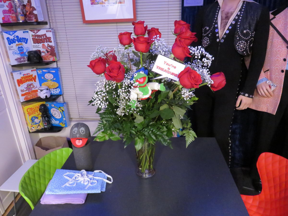 Sunday the 14th – VALENTINE’S DAY PASSENGER! – My friend Michelle got in from Florida just after noon, and I drove to LAX to pick her up. I had several Valentine’s surprises for her lined up. Since we were on the Westside of L.A. I took her by the apartment I lived in for the first several years of my life in Los Angeles. Then we got lunch at Campo’s, my favorite Mexican restaurant. We parked beside a quaint Culver City park to chat and eat lunch, and then I took her by a car dealership that she had been following on-line. Since she’s moving to L.A. permanently in a few weeks, she had been researching a necessary car purchase, and found a few really good options at this particular dealership. So I took her over there so she could test drive the vehicles that piqued her interest. Then we drove to Planet Wallywood to get her unpacked and settled. She loved the Kermit arrangement of roses that was waiting for her, and I had her start cutting the foam pieces for the Prairie Dawn puppet head we’d be working on.
