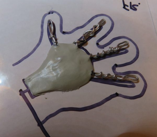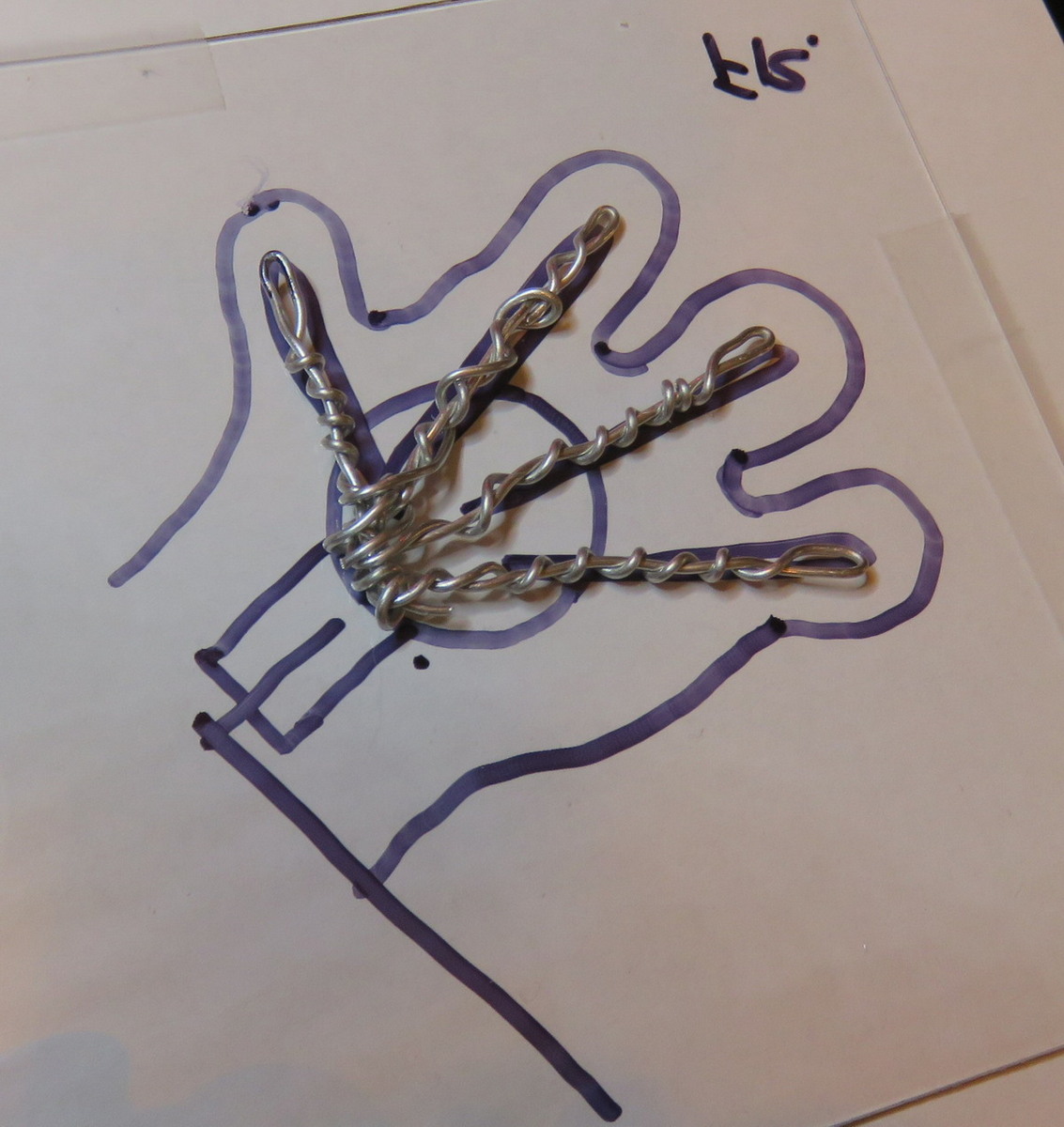 I form the wires for the puppet’s bendable fingers on a diagram I designed