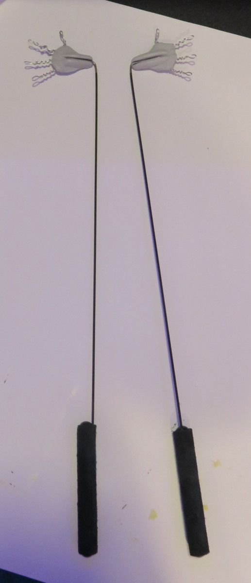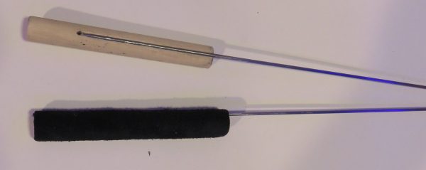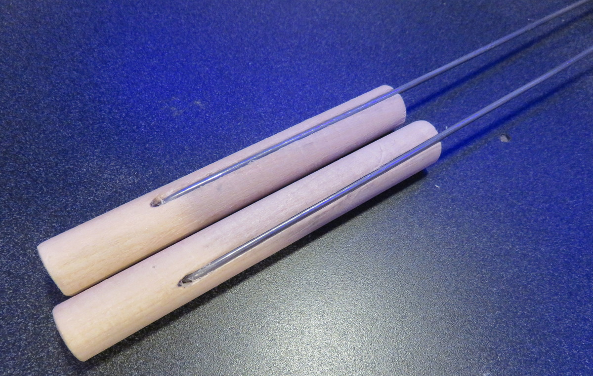 The wood dowels are cut to size, the holes are drilled for the wire to sit in, and I dig a small groove into the wood so the length of the wire can be embedded into the handle so it will be flush with the suede covering is added.