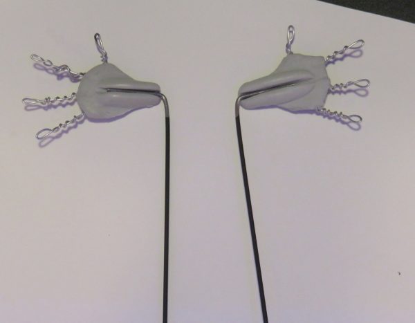 When the wires are bent into place properly, I cover the base with an epoxy putty called Magic Sculpt. Once it hardens the wires will be secure in the hand piece.